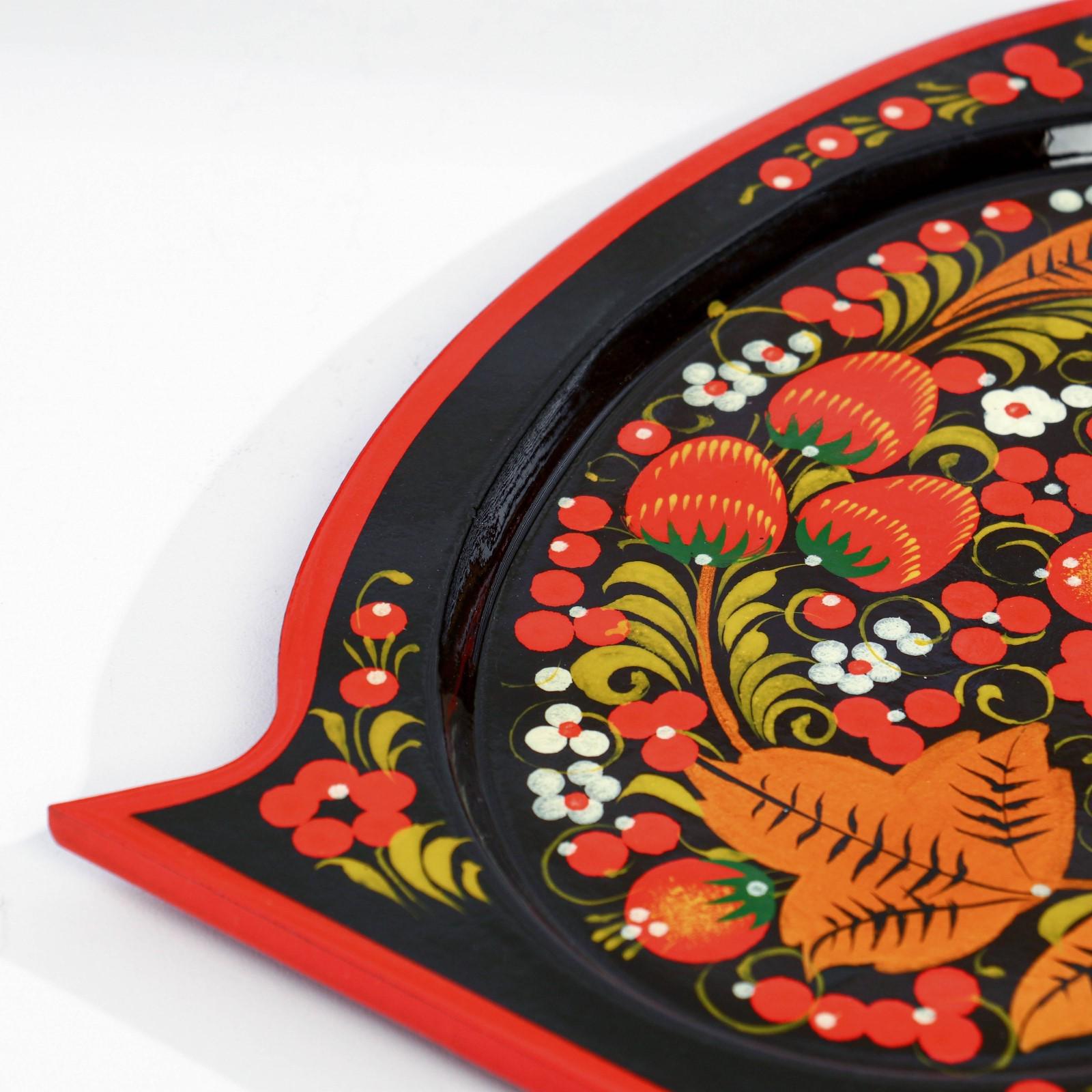 Традиционные элементы Хохломы — ягоды рябины и земляники, цветы и листья, птицы, рыбы и звери.