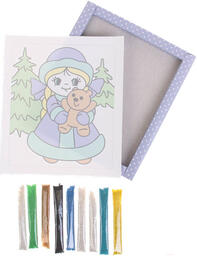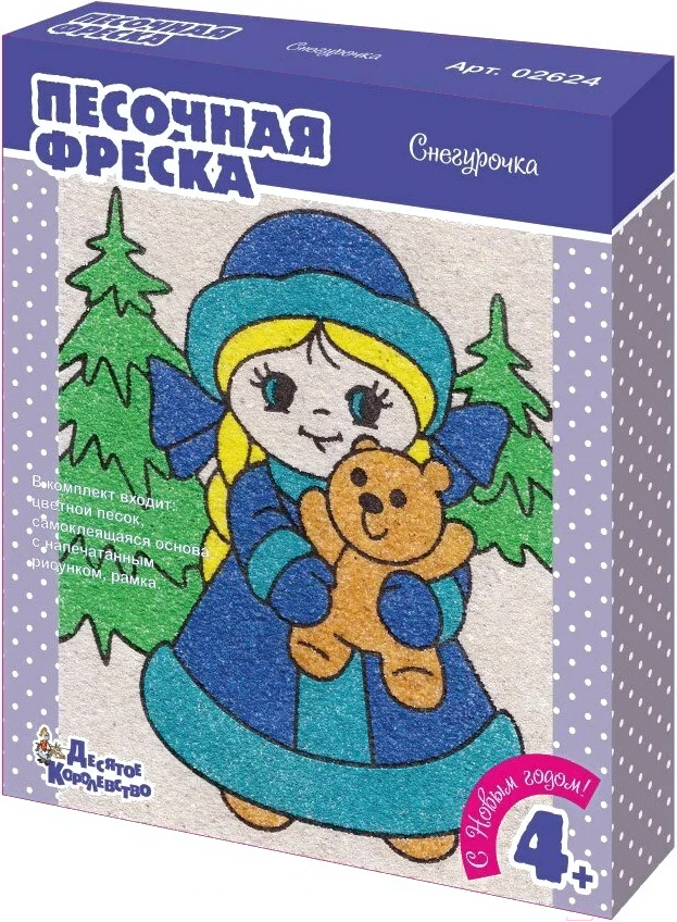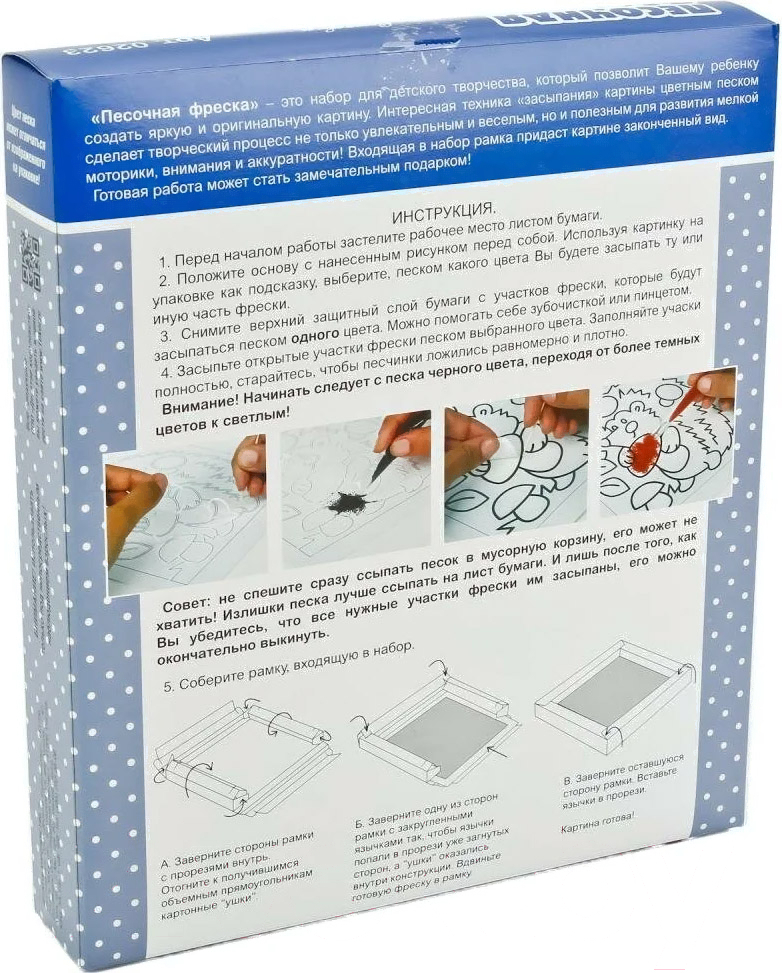 - Комплектация набора подложка на самоклеящейся основе с напечатанным рисунком 19х22 см, заготовка для рамки, цветной песок