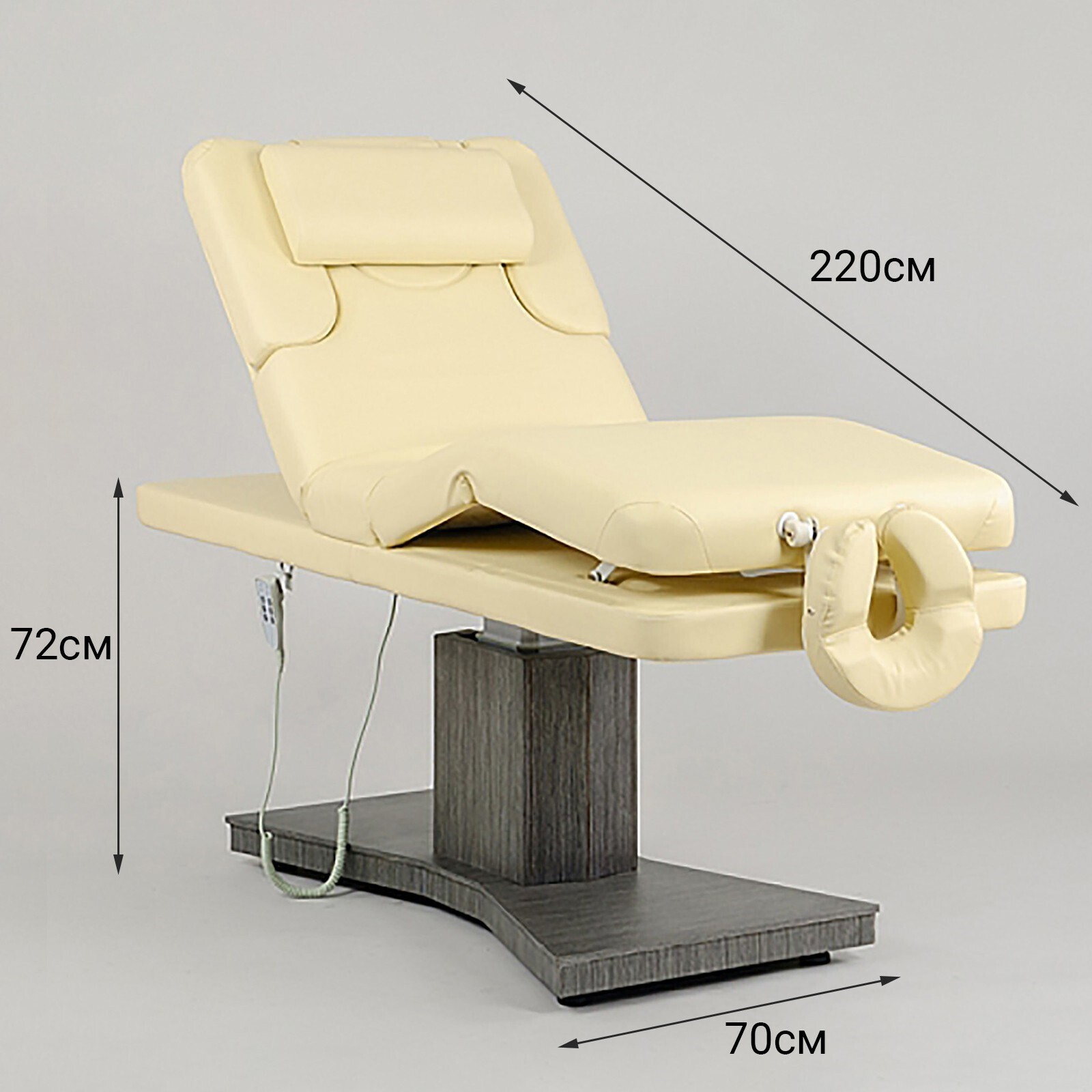 СПА-кушетка SD-3805F оснащена тремя электромоторами для регулировки положения спинки, ножной части и высоты стола. Управление всеми регулировками осуществляется с помощью пульта. Матрас оснащен отверстием для лица и съемными подлокотниками. В комплект поставки входит подушка для головы и съемный подголовник с отверстием для лица.