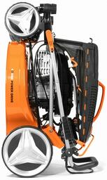 Техника оснащена специальным 4-тактным мотором с мощностью в 6,0 л.с. Он имеет облегченный ручной запуск, надежный в работе, мало расходует бензин и масло. Благодаря крутящему моменту 2800 об/мин и скорости вращения вала техника показывает высокую производительность и легко справится с кошением в горку или с влажной травой. При этом в наличие все системы защиты, поэтому мотор прослужит долго. Для работы в разных условиях можно подобрать оптимальную скорость с помощью рычага вариатора на рукоятке.