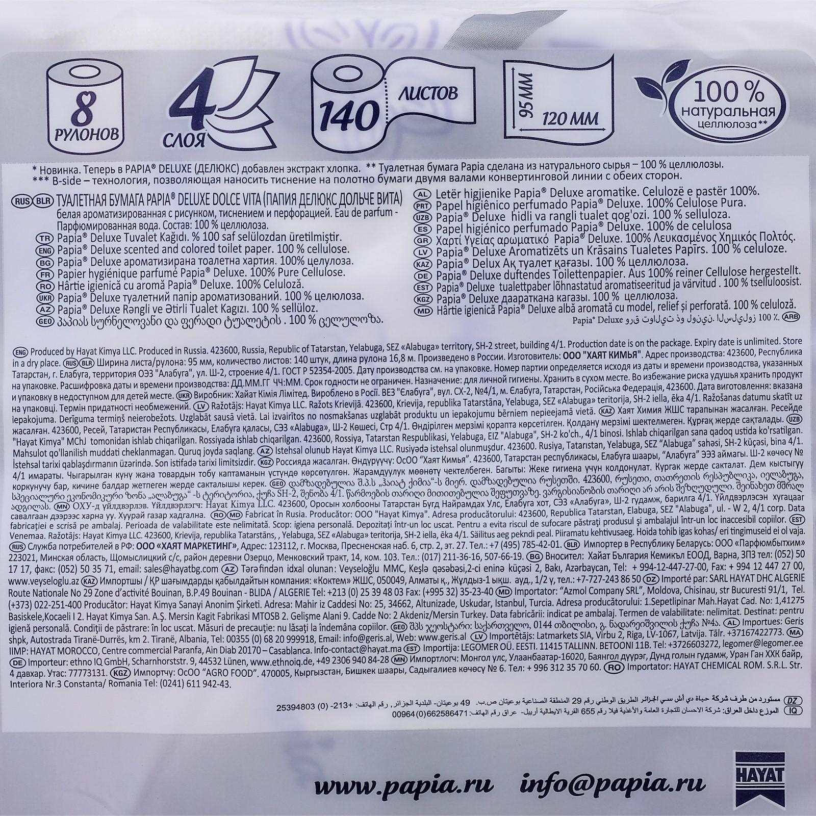Туалетная бумага PAPIA DELUXE Dolce Vita, 4 слоя, 8 рулонов