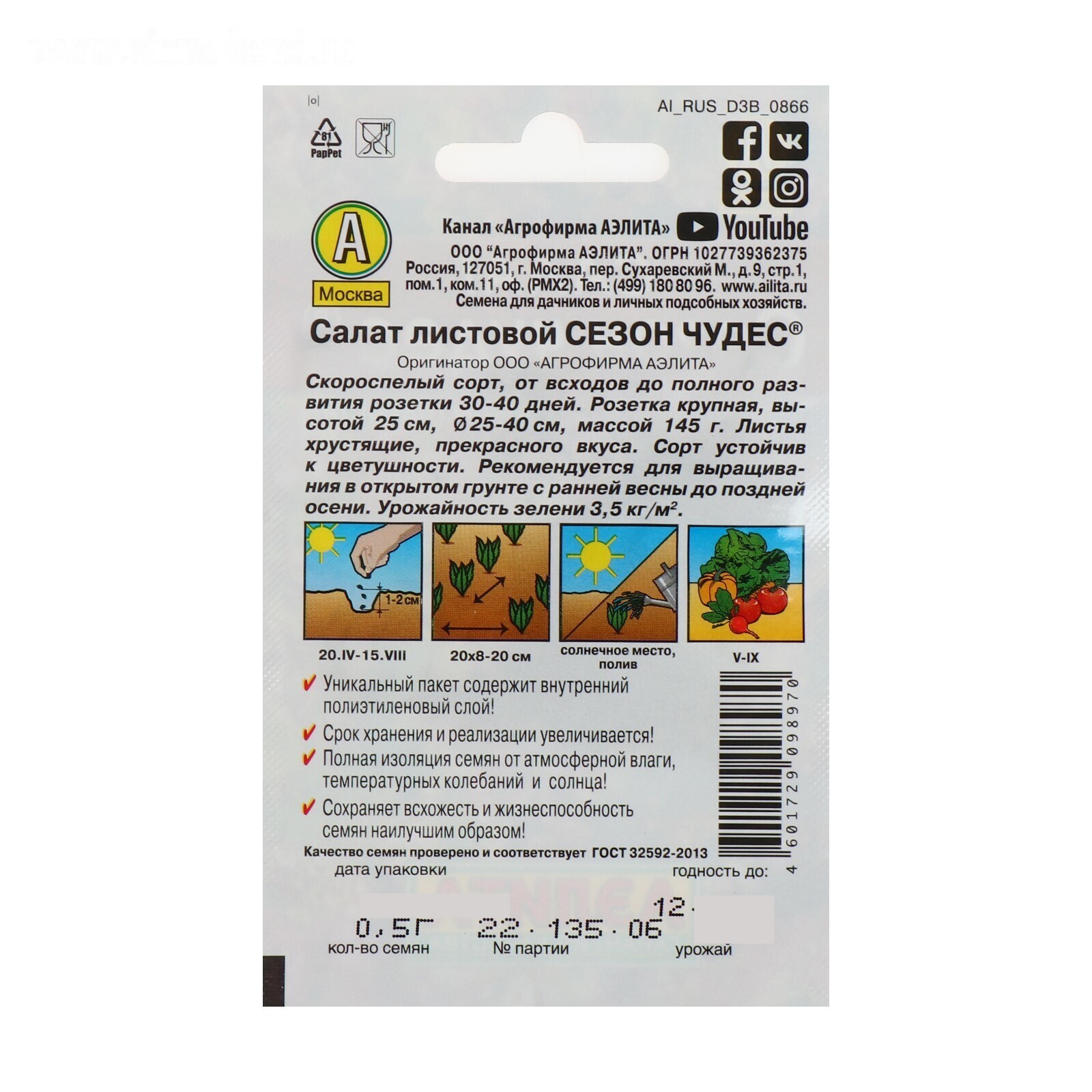 «Сезон чудес» — это листовой скороспелый сорт салата, у которого период от всходов до полного развития розетки длится 40–50 дней. Устойчив к цветушности. Подходит для выращивания в открытом грунте с ранней весны до поздней осени.