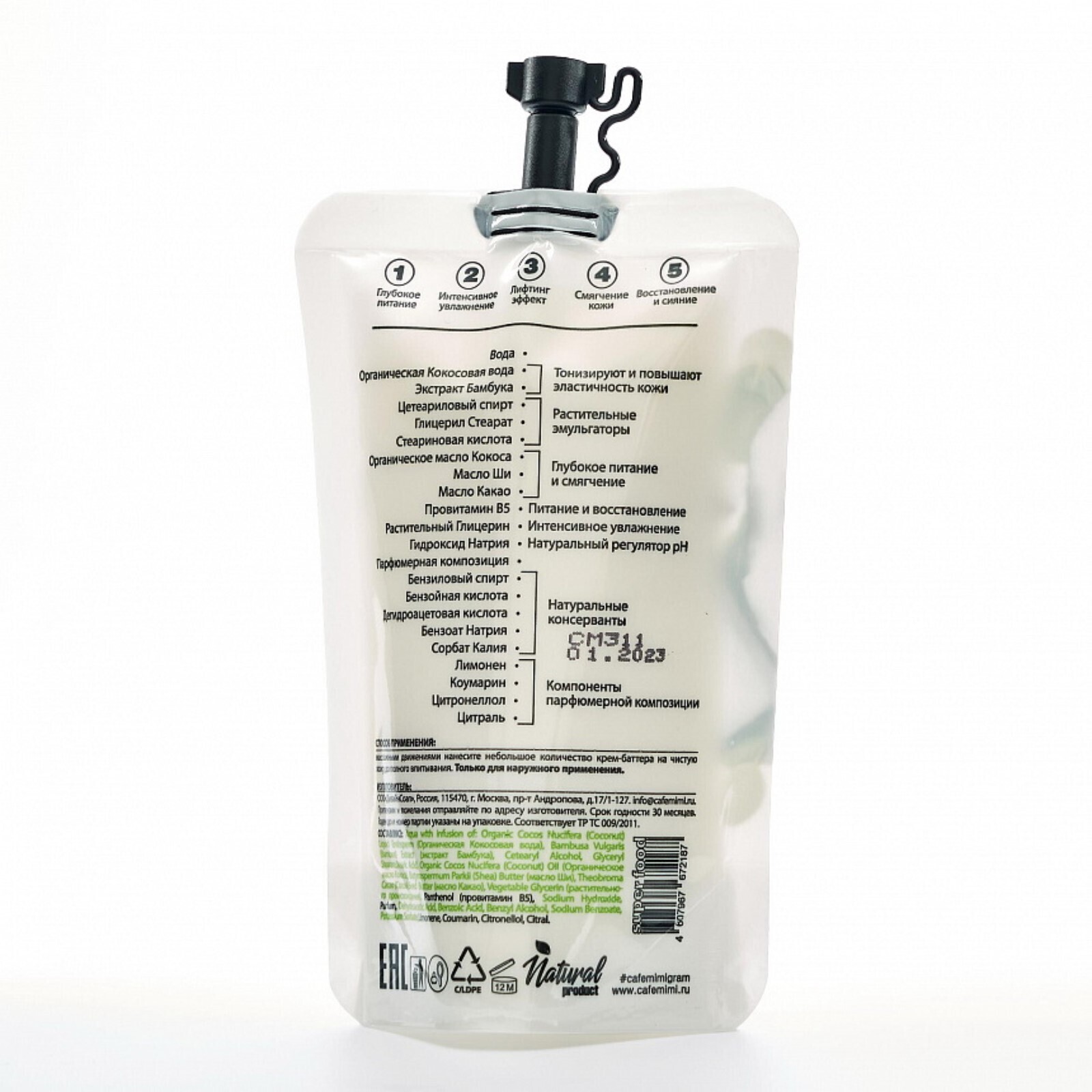 Aqua, Prunus Amygdalus Dulcis Oil (масло миндаля), Elaeis Guineensis Oil, Cetearyl Alcohol, Glyceryl Stearate, Butyrospermum Parkii Butter (масло ши), Organic Cocos Nucifera Oil (органическое масло кокоса), Theobroma Cacao Seed Butter (масло какао), Glycerin (растительного происхождения), Stearic Acid, Palmitic Acid, Organic Cocos Nucifera Liquid Endosperm (органическая кокосовая вода), Bambusa Vulgaris Extract (экстракт бамбука), Panthenol (провитамин В5), Sodium Hydroxide, Lactic Acid, Benzyl Alcohol, Phenoxyethanol, Parfum, Citral, Coumarin, Citronellol, Limonene.