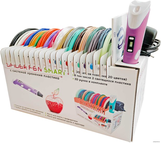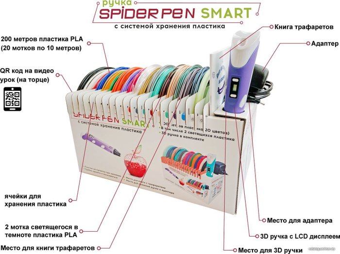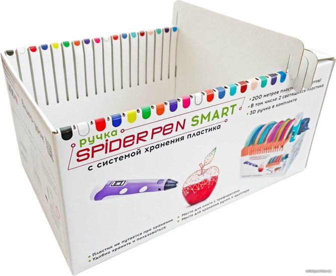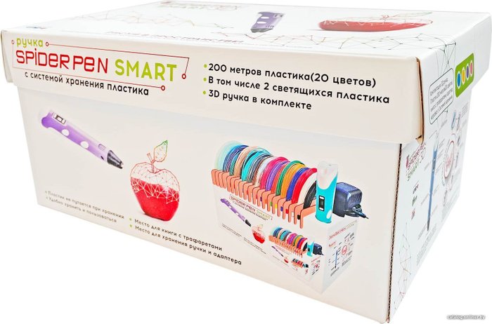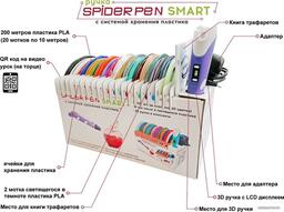 - Комплектация 3D ручка Spider Pen PLUS;Книга трафаретов;20 цветов пластика PLA (в том числе 2 светящихся в темноте);Адаптер питания;Русифицированная и красочная упаковка;Инструкция.