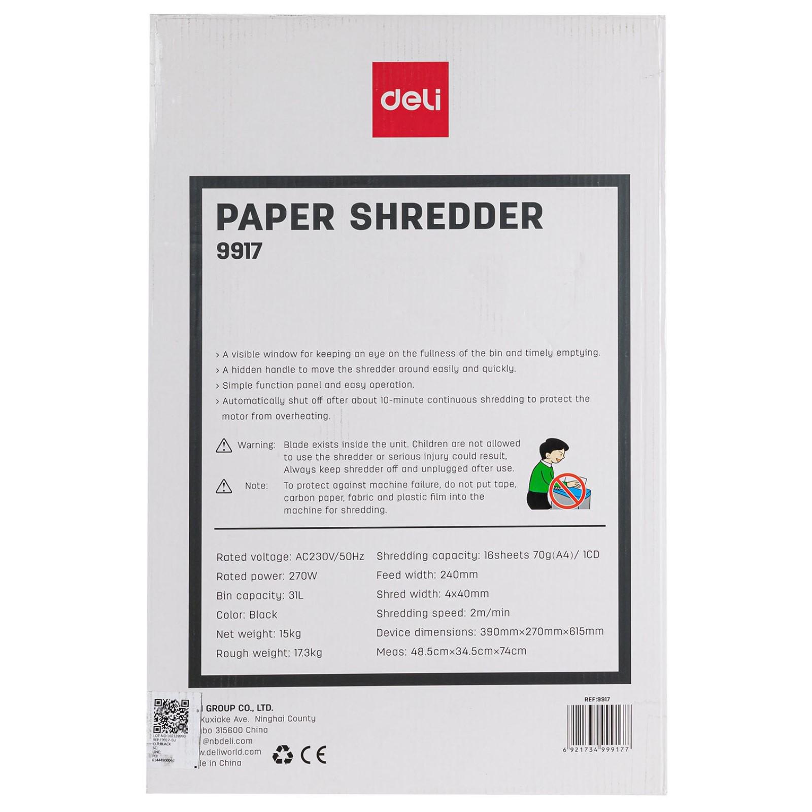 Шредер Deli E9917-EU, фрагменты 4х40мм, 16 листов, скрепки, скобы, пл.карты