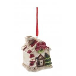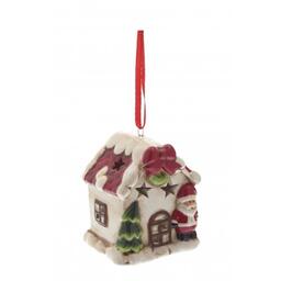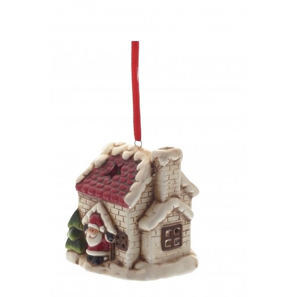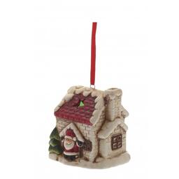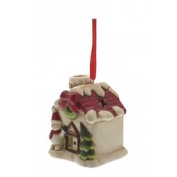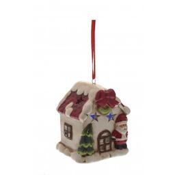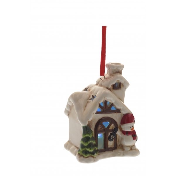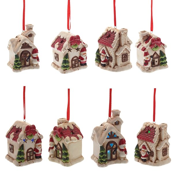 Новогоднее украшение с подсветкой "Домик". Великолепная подвеска для елки создаст неповторимое ощущение праздника. Представлено в 4 вариантах. Изготовлено из керамики, покрыто глазурью. Работает от 2 батареек LR 44.