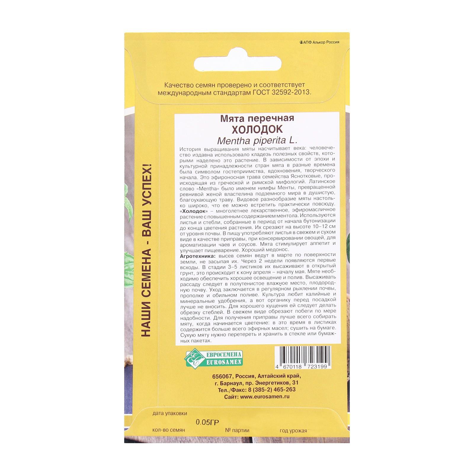 Среднеспелый сорт (период от всходов до начала цветения 80 дней). Растение многолетнее, высотой до 70 см. Стебель ветвистый, высокооблиственный. Листья зеленые, гладкие, край зазубренный. Всё растение очень ароматное. Урожайность зеленой массы с одного растения при двукратной уборке 650 г. Листья и молодые побеги можно использовать в свежем и сушеном виде. Мяту в качестве ароматизатора добавляют в чай и другие напитки, украшают фруктовые салаты.