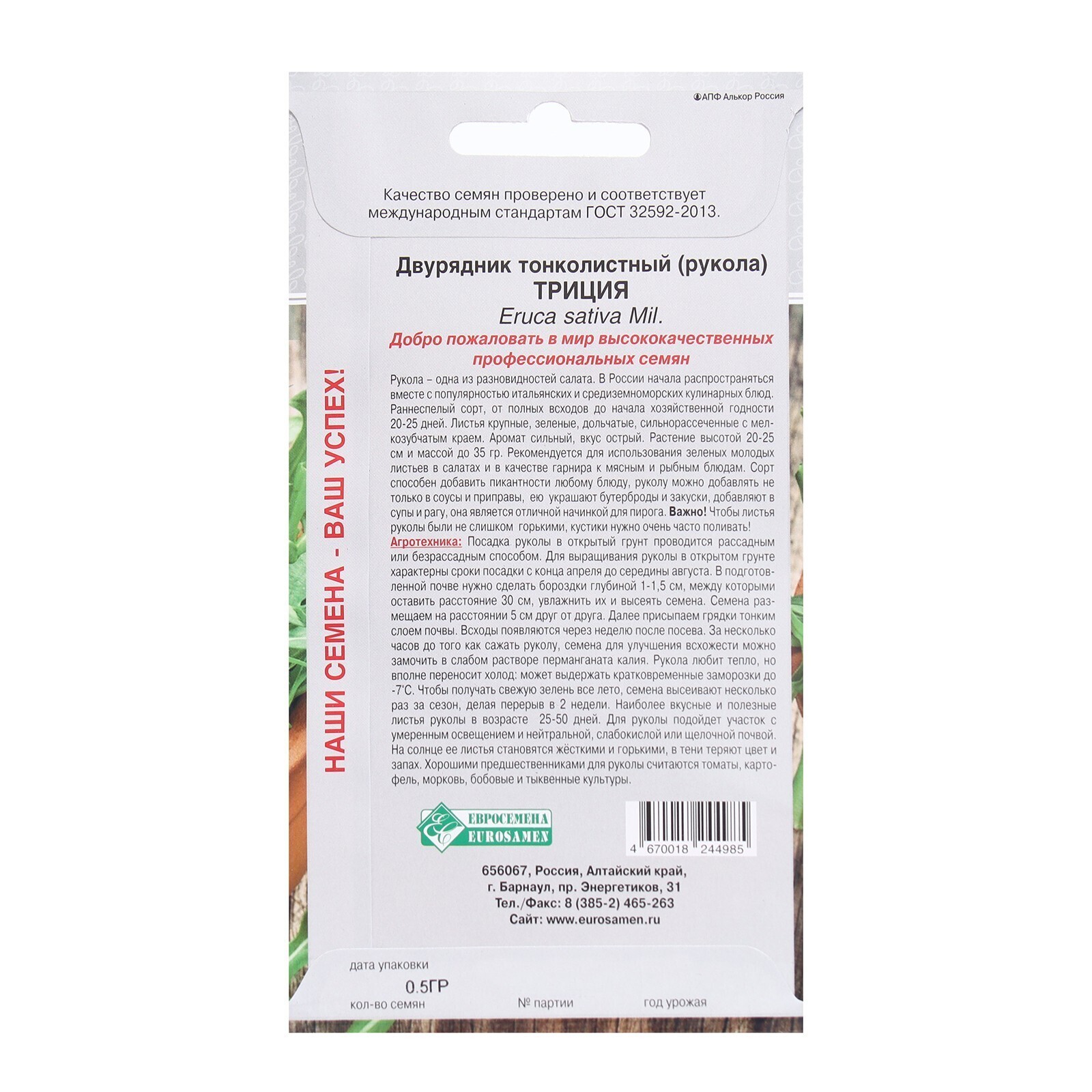 Семена Двурядник тонколистный, рукола Триция, 0,5 г