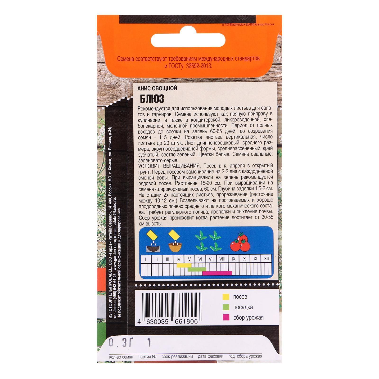 Анис – достаточно холодостойкая культура, предпочитает плодородные почвы и солнечное местоположение. Семена высевают в открытый грунт ранней весной. Прорастание семян медленное, всходы появляются через 16-20 дней. Расстояние между рядками 50 см. Сеянцы прореживают, оставляю расстояние между растениями 15-20 см. Уход заключается в прополках, рыхлении и поливах по необходимости. При выращивании аниса на семена соцветия убирают выборочно, т.к. созревание семян неодновременное. Полностью вызревшие семена быстро осыпаются.