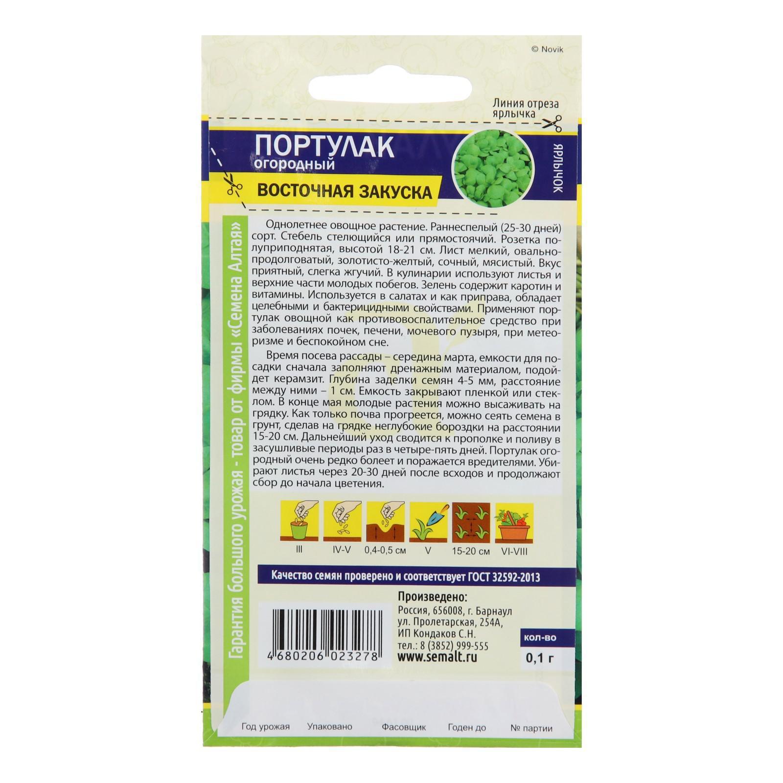 Однолетнее овощное растение. Раннеспелый (25-30 дней) сорт. Стебель стелющийся или прямостоячий. Розетка полуприподнятая, высотой 18-21 см. Лист мелкий, овально-продолговатый, золотисто-желтый, сочный, мясистый. Вкус приятный, слегка жгучий. В кулинарии используют листья и верхние части молодых побегов. Зелень содержит каротин и витамины. Используется в салатах и как приправа, обладает целебными и бактерицидными свойствами. Применяют портулак овощной как противовоспалительное средство при заболеваниях почек, печени, мочевого пузыря, при метеоризме и беспокойном сне. Время посева рассады – середина марта, емкости для посадки сначала заполняют дренажным материалом, подойдет керамзит. Глубина заделки семян 4-5 мм, расстояние между ними – 1 см. Емкость закрывают пленкой или стеклом. В конце мая молодые растения можно высаживать на грядку. Как только почва прогреется, можно сеять семена в грунт, сделав на грядке неглубокие бороздки на расстоянии 15-20 см. Дальнейший уход сводится к прополке и поливу в засушливые периоды раз в четыре-пять дней. Портулак огородный очень редко болеет и поражается вредителями. Убирают листья через 20-30 дней после всходов и продолжают сбор до начала цветения.