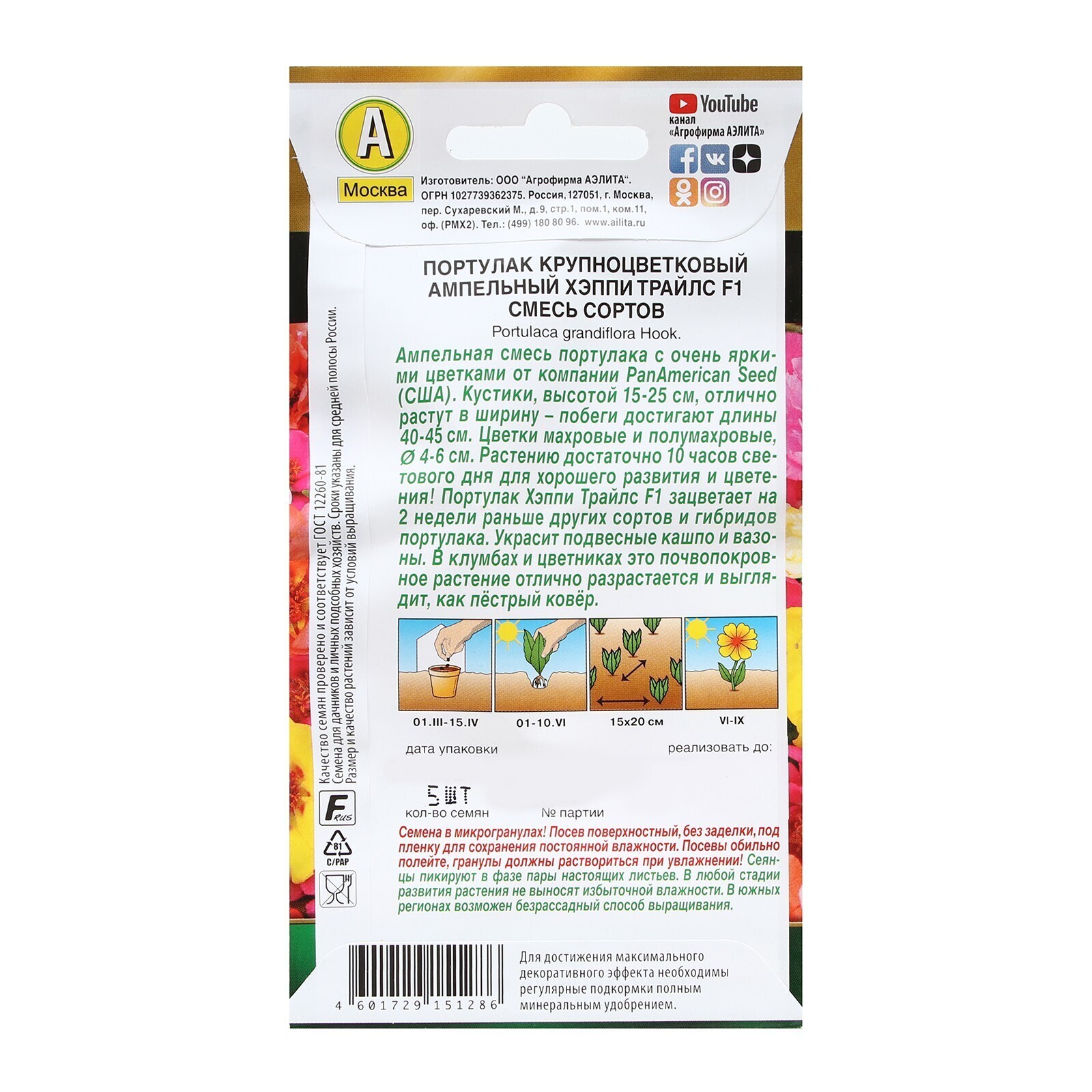 Посев поверхностный, без заделки, под пленку для сохранения постоянной влажности. Посевы обильно полейте, гранулы должны раствориться при увлажнении! Сеянцы пикируют в фазе пары настоящих листьев. В любой стадии развития растения не выносят избыточной влажности. В южных регионах возможен безрассадный способ выращивания. Изображение товара может не соответствовать внешнему виду.