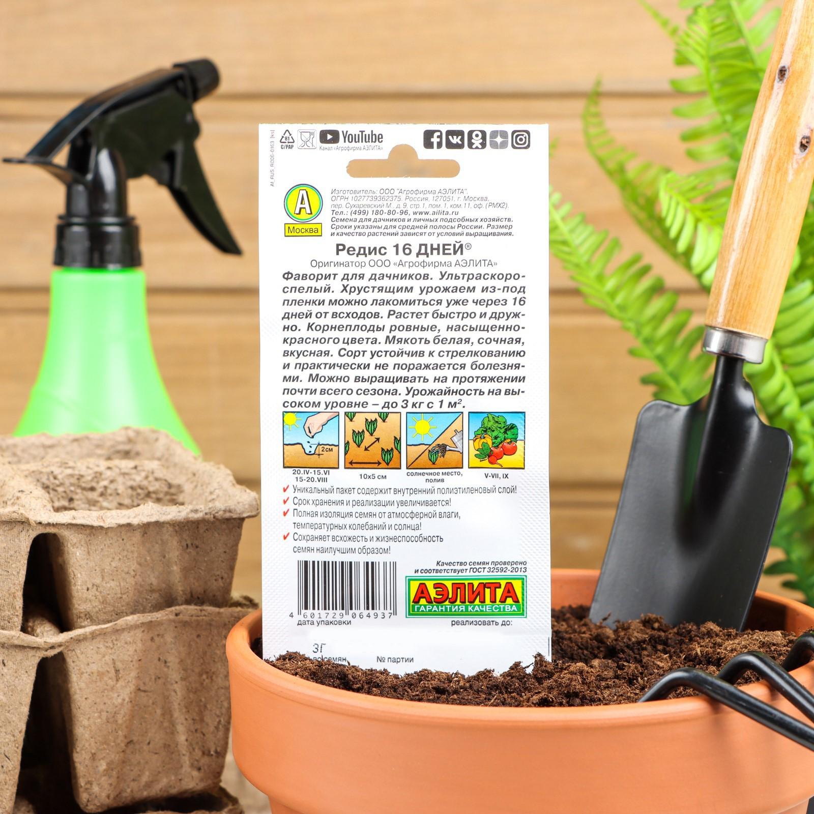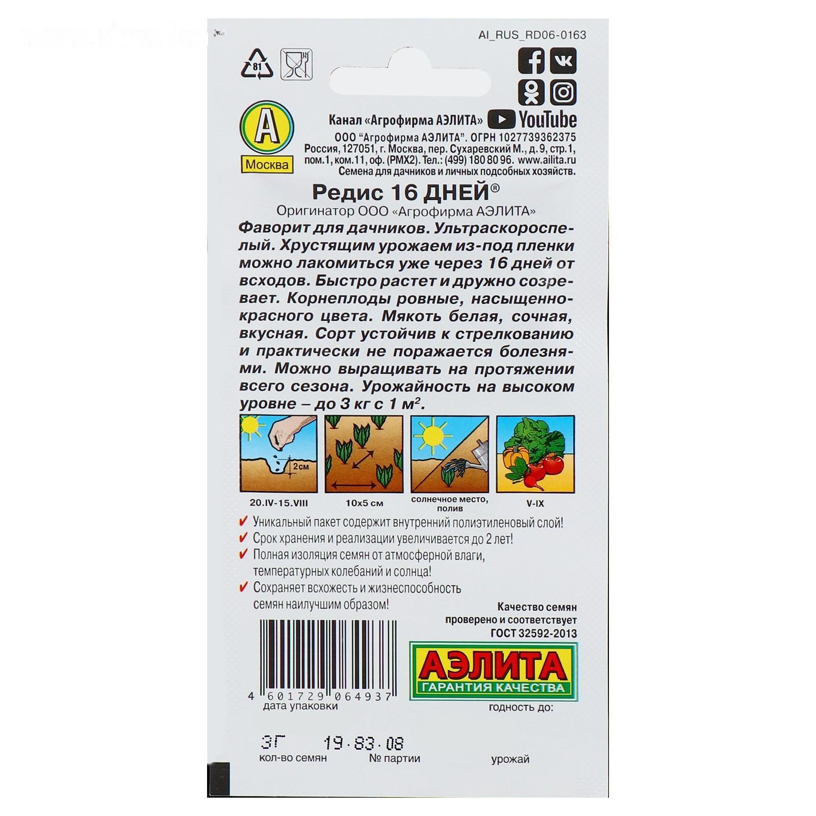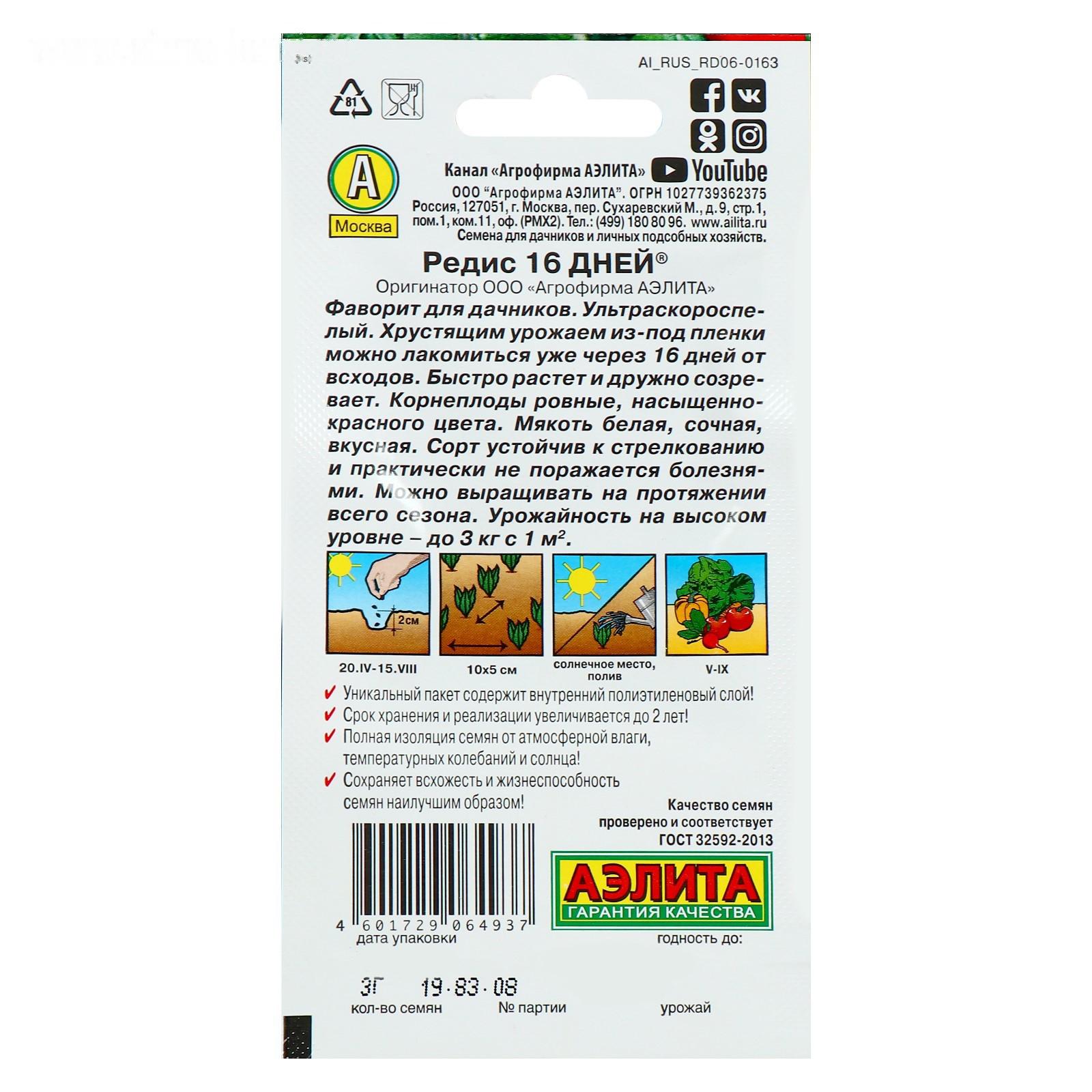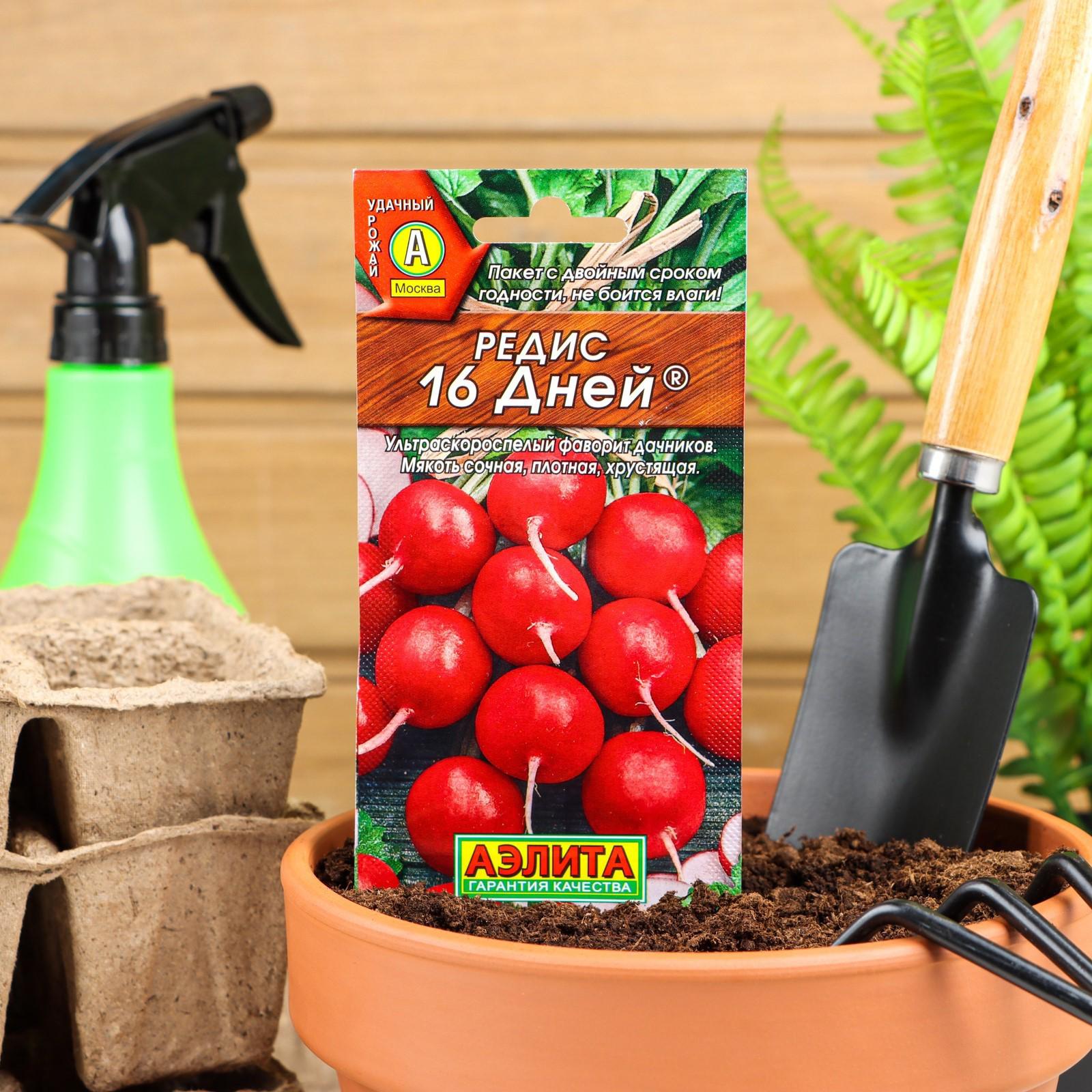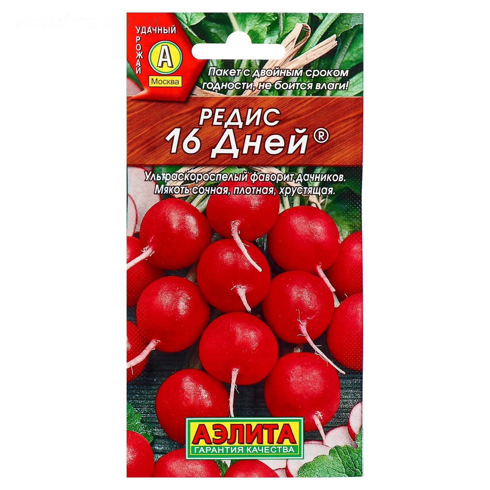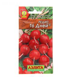 «16 дней» представляет собой ультраскороспелый высокоурожайный сорт редиса, устойчивый к растрескиванию и стрелкованию. Предназначен для открытого и защищённого грунта. Растение имеет выравненные ярко-красные плоды округлой формы со слабоострым вкусом.
