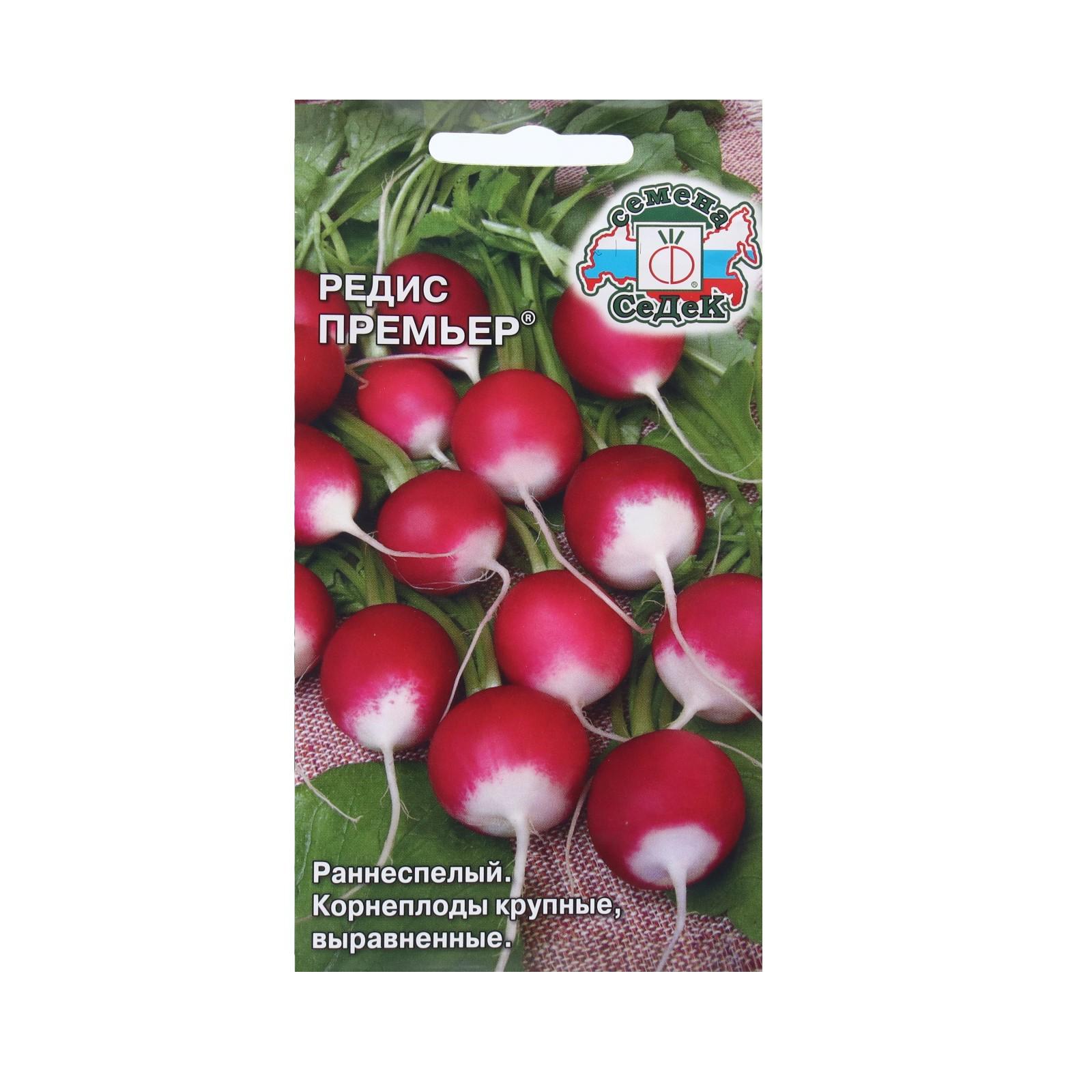 Является ранним сортом по сроку поспевания. От всходов до урожая может пройти 20-25 дней. Корнеплоды обладают круглой формой, яркого красно-розового окраса с белым тоненьким хвостиком. В диаметре плоды достигают 2,2-4 см, а массу достигают 18-22 г. Мякоть содержит много сока, белого цвета с розовым оттенком, чуть острая на вкус. Если срок уборки затянуть до 28 дней, то вес плодов увеличится до 25-30 г, однако они не утратят товарные качества. "Премьер" не подвержен цветению и устойчив к заболеваниям. Используется для употребления в свежем виде.