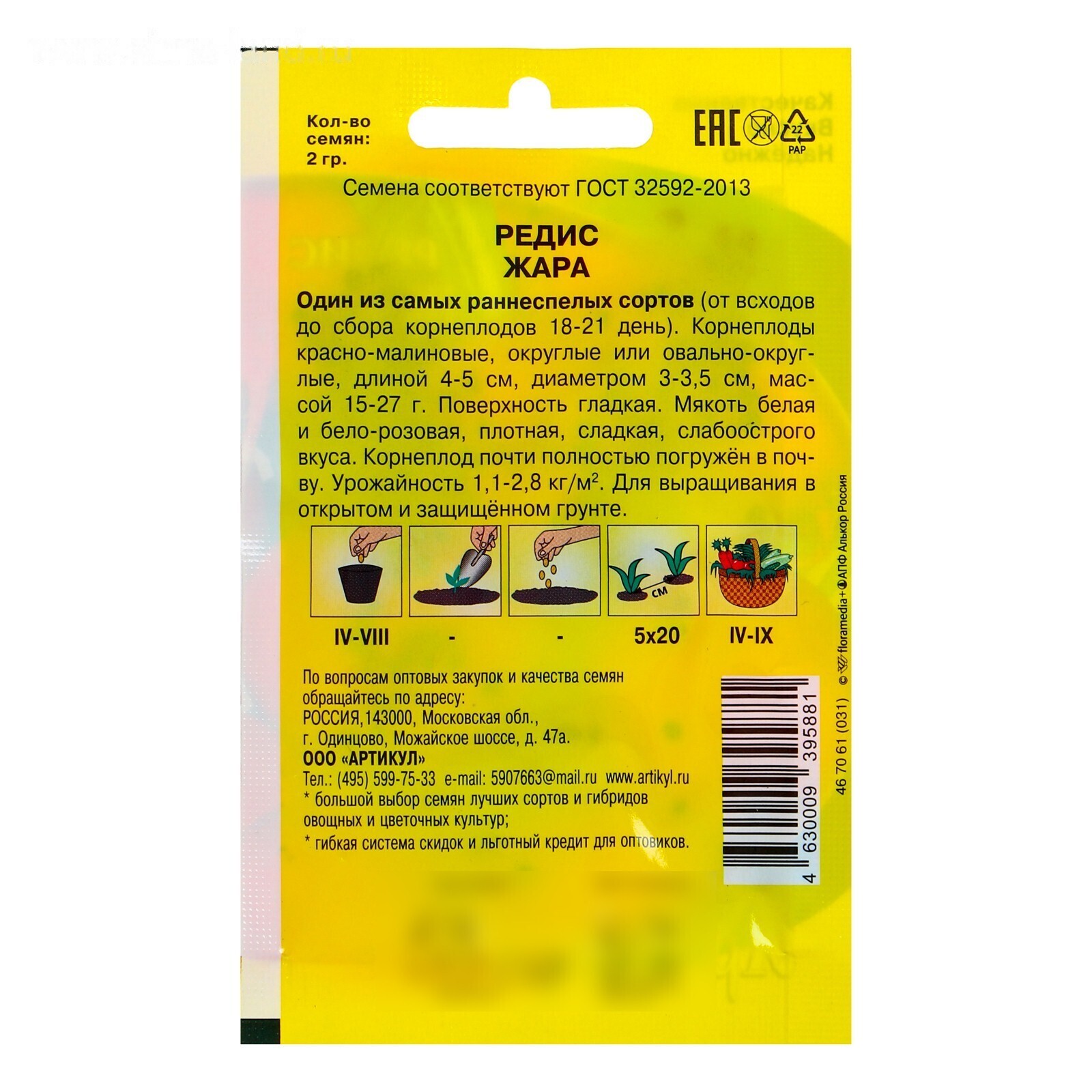 Один из самых раннеспелых сортов (от всходов до сбора корнеплодов 18-21 день). Корнеплоды красно-малиновые, округлые или овально-округлые, длиной 4-5 см, диаметром 3-3,5 см, массой 15-27 г. Поверхность гладкая. Мякоть белая и бело-розовая, плотная, сладкая, слабоострого вкуса. Корнеплод почти полностью погружён в почву. Урожайность 1,1- 2,8 кг/м2. Для выращивания в открытом и защищённом грунте.