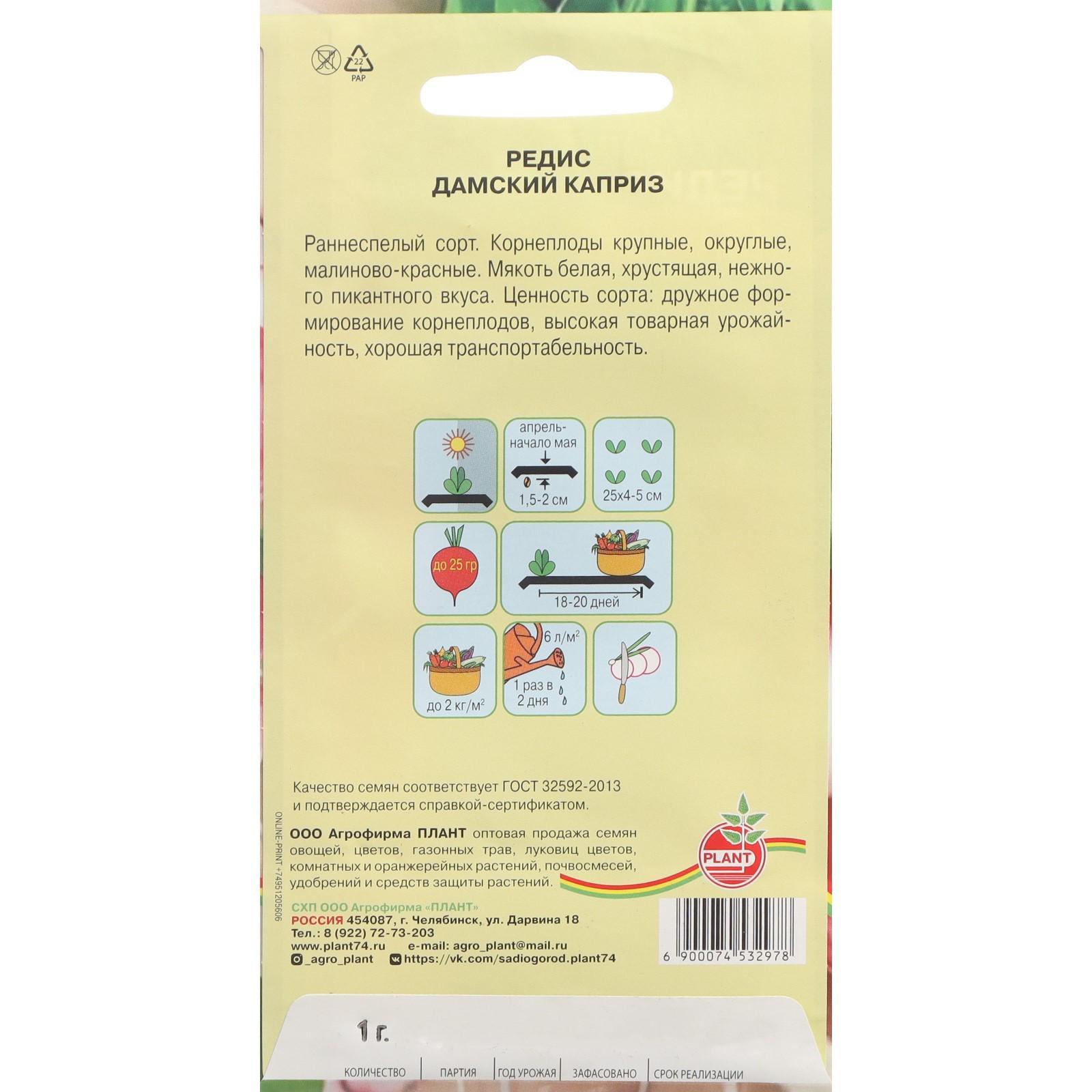 Редис Дамский каприз - наиболее скороспелый сорт редиса в сибирских условиях с возможностью формирования товарного корнеплода за 18-22 дня в зависимости от погодных условий: обилие солнечных дней ускоряет рост и развитие растений. Корнеплод крупный округлый, с равномерной ярко-красной окраской, имеет белую, стекловидную, нежную, сочную мякоть слабо-острого вкуса без деревянистых включений. Предназначен для выращивания в открытом грунте с весны до осени.