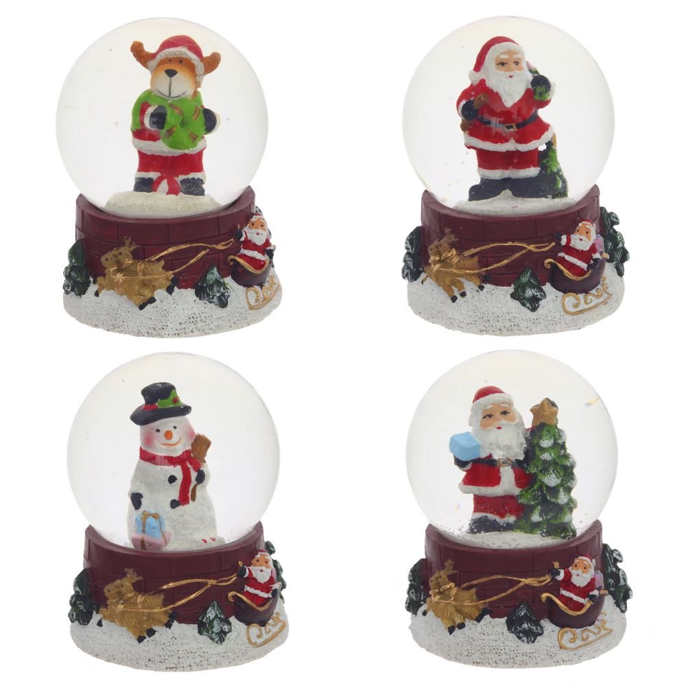 Фигурка декоративная "Новогодняя" в стеклянном шаре диаметром 4,5 см. Шар заполнен водой с глиттером, фигурка и подставка изготовлены из полимерных материалов. Представлена в четырех вариантах. Внимание: при длительном нахождении в минусовой температуре возможно образование льда, который сместит фигурку и повредит шар.
