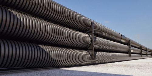 Двустенные трубы ДКС используются для прокладки электропроводки и кабельных линий в кабельных сооружениях и наружных электроустановках: мосты, путепроводы, эстакады, галереи, в местах выходов из земли и вводе в здание. Диаметр - 125 мм. Материал - полиэтилен низкого давления (ПНД). Внешняя стенка - черная, внутренняя - голубая. Каждый отрезок трубы комплектуется стальной протяжкой и соединительной муфтой. Температура эксплуатации от -55 до +90 С. Длина трубы - 50 м.