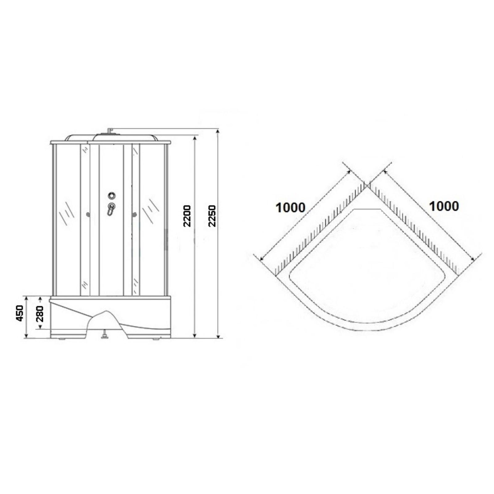Кабина оснащена высоким акриловым поддоном, высота от пола до бортика - 46 см, глубина чаши - 32 см. Поддон закреплен на металлический каркас для устойчивости и прочности, регулируется настраиваемыми ножками. Панель съемная, есть сидение. Сифон идет в комплекте.
