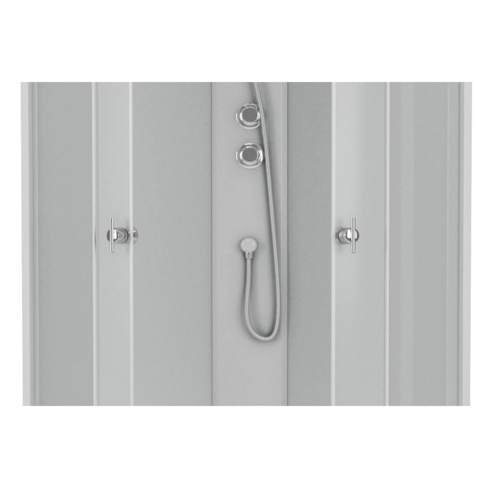 Задние стенки - каленое стекло, крашенные с обратной стороны, не обрамленные алюминиевым профилем. Двери и передние неподвижные стенки сделаны из каленого стекла, матовые. Двери передвигаются на одинарных роликах по профилю.