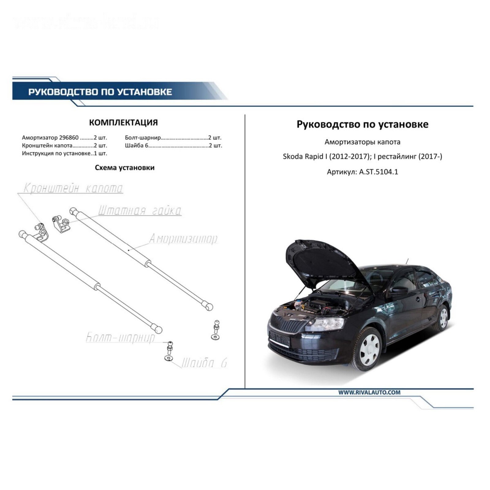 Амортизаторы капота RIVAL, Skoda Rapid, Volkswagen Polo 2012-н.в., 2шт., A.ST.5104.1
