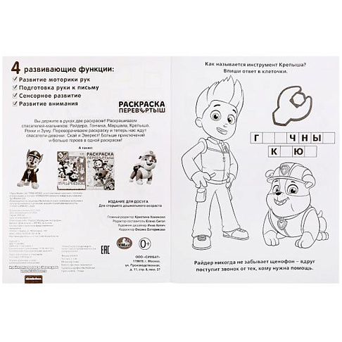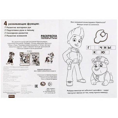 - необычный формат «переверни обложку»: раскраска со спасателями-мальчиками и раскраска со спасателями-девочками