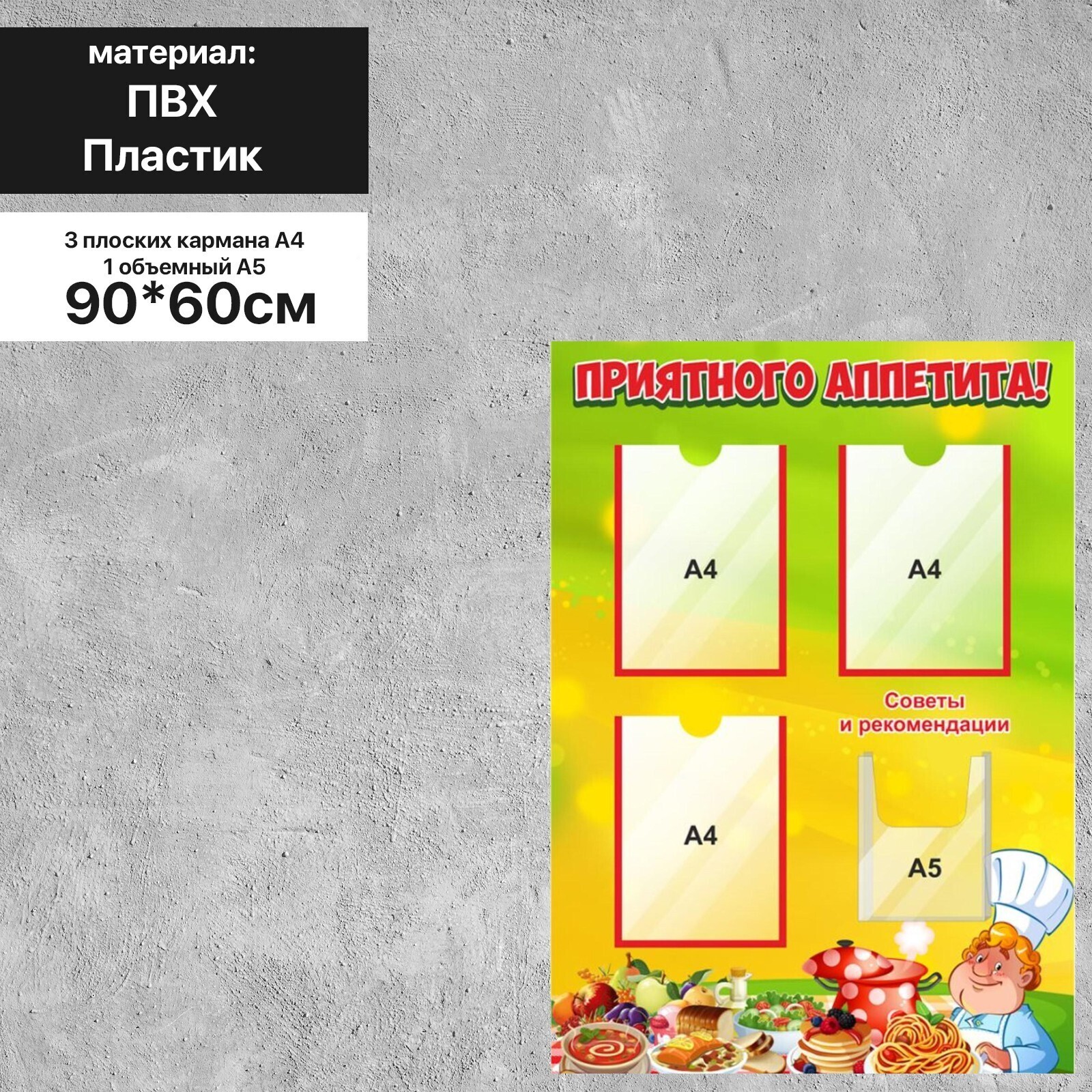 Стенд в детский сад "Приятного аппетита" на 3 плоских кармана А4 и 1 объемный А5, 90см*60см 693222
