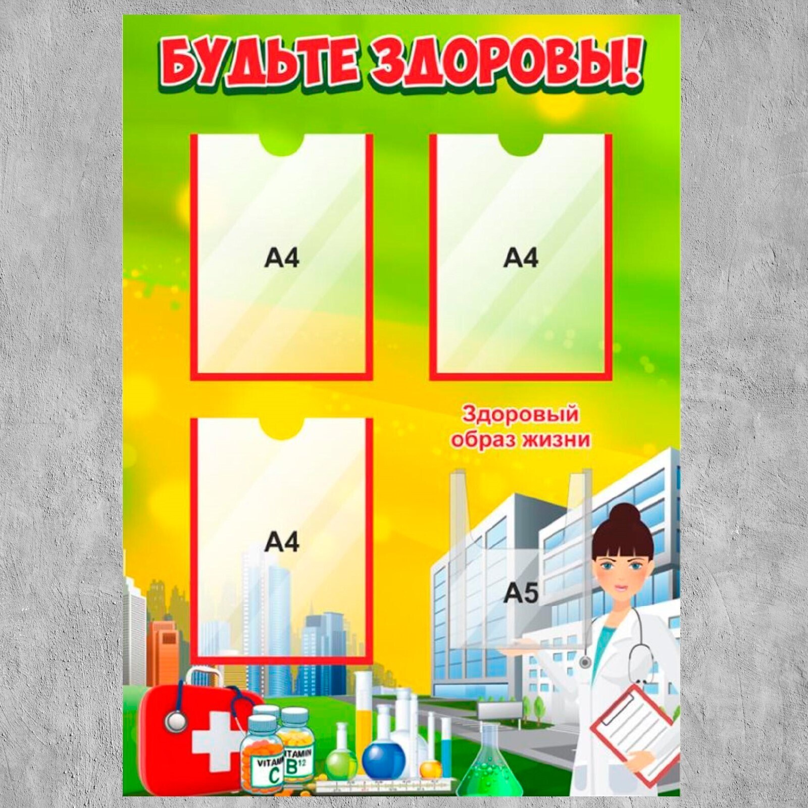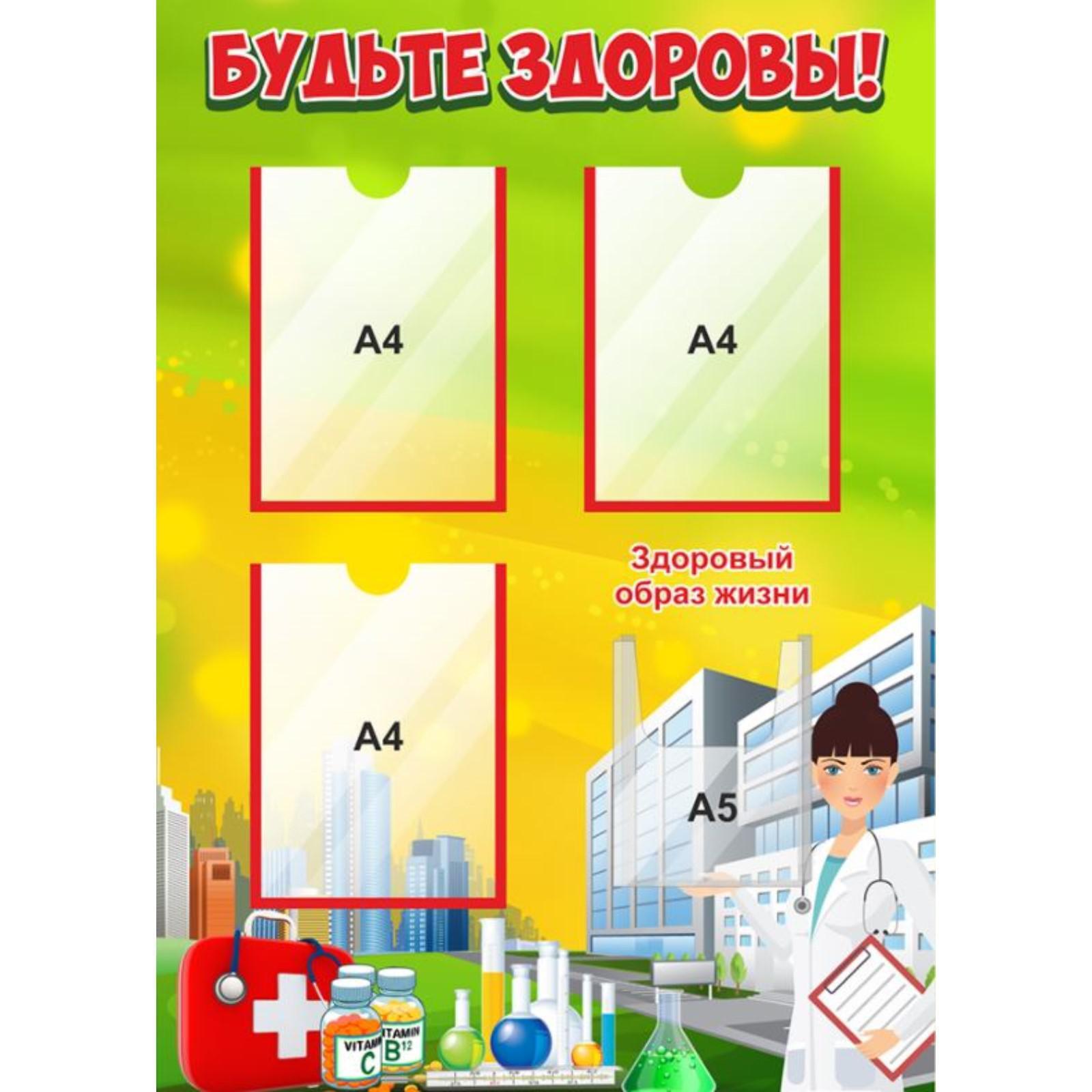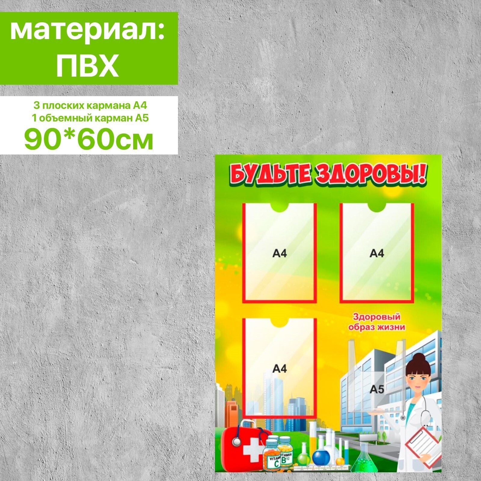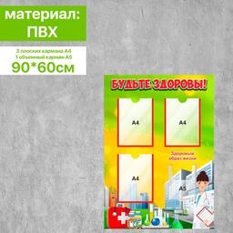 Информационный стенд "Будьте здоровы" 3 плоских кармана А4 и 1 объемный А5, 90см*60см