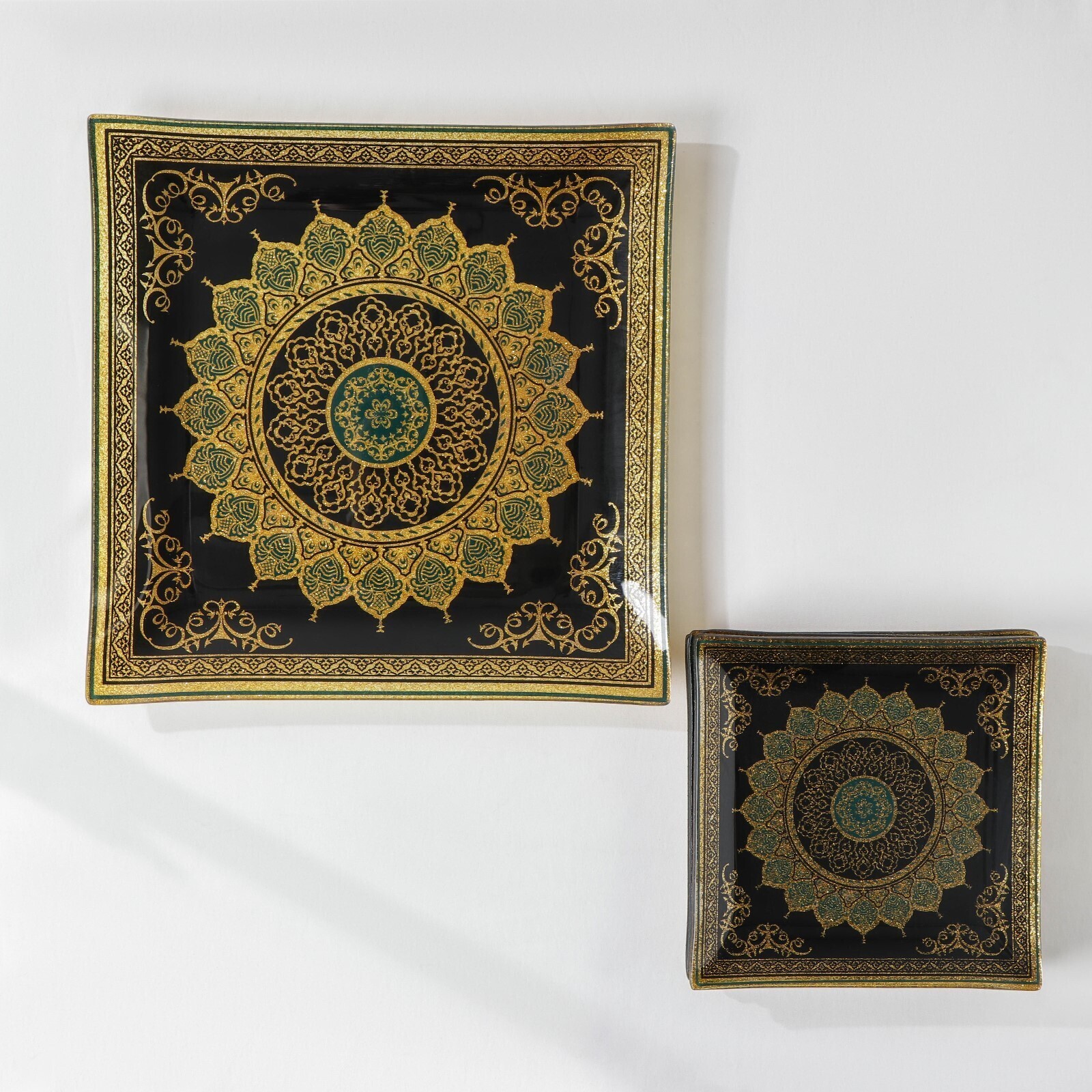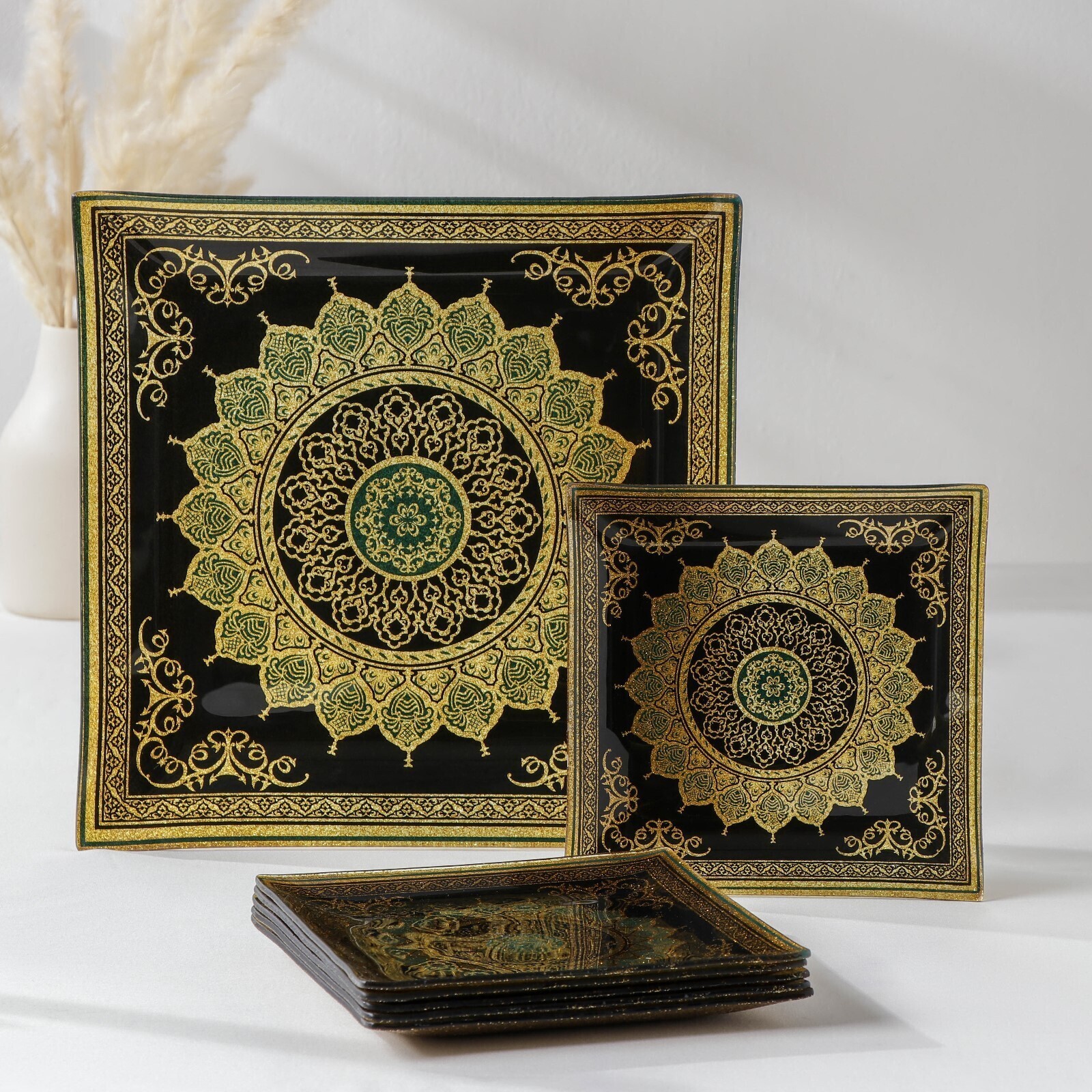 Набор столовый «Мехенди», 7 предметов: d=30 см - 1 шт, d=18 см - 6 шт, цвет золотой, черный. Набор столовый состоит из семи предметов: блюда d=30 см и шести тарелок d=18 см. Все предметы изготовлены из качественного стекла и имеют орнамент в восточном стиле. Тарелки прекрасно подойдут для сервировки праздничного стола, для семейного ужина или обеда.