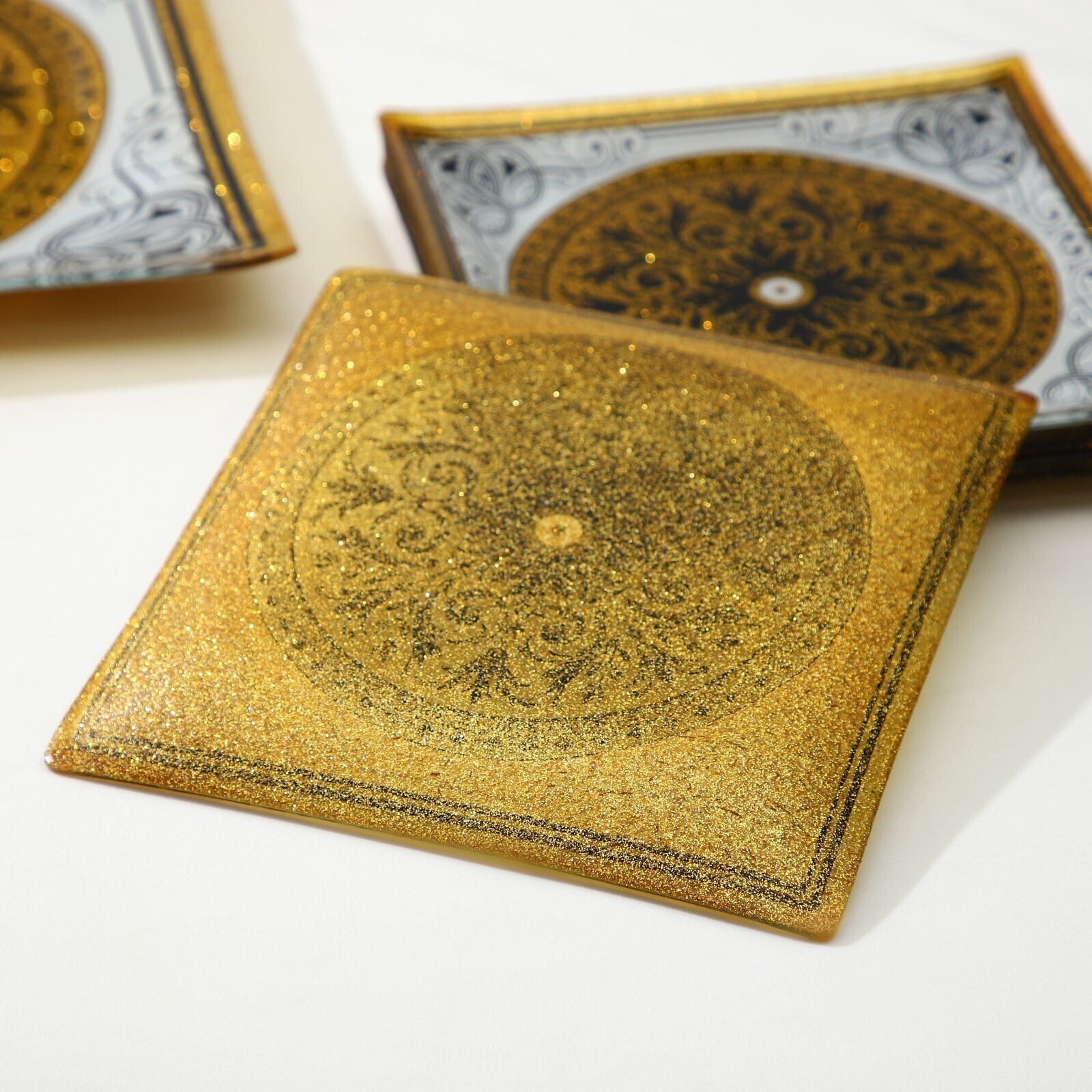 Набор столовый состоит из семи предметов: блюда 30×30 см и шести тарелок 18×18 см. Все предметы изготовлены из качественного стекла и имеют орнамент в восточном стиле. Тарелки прекрасно подойдут для сервировки праздничного стола, для семейного ужина или обеда.