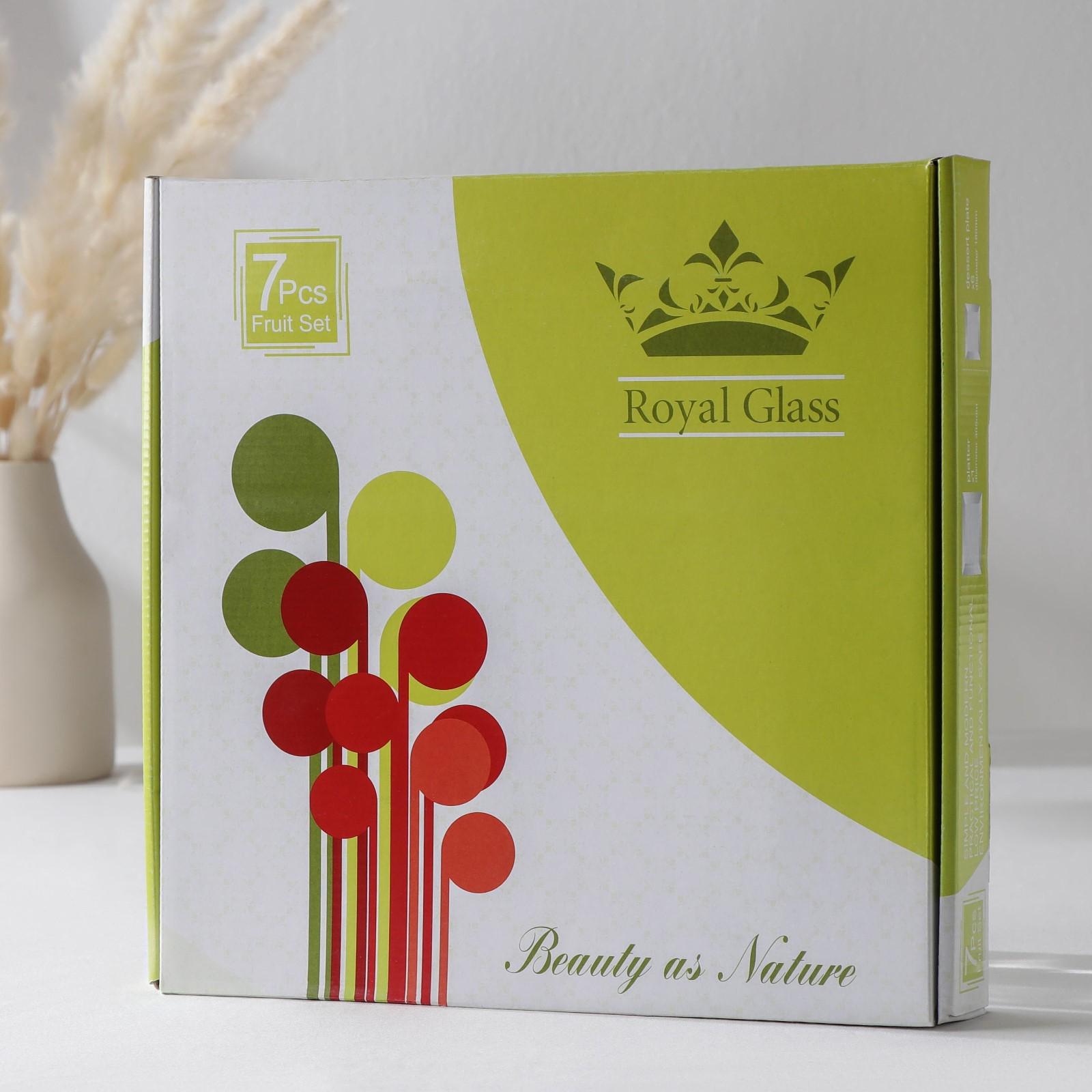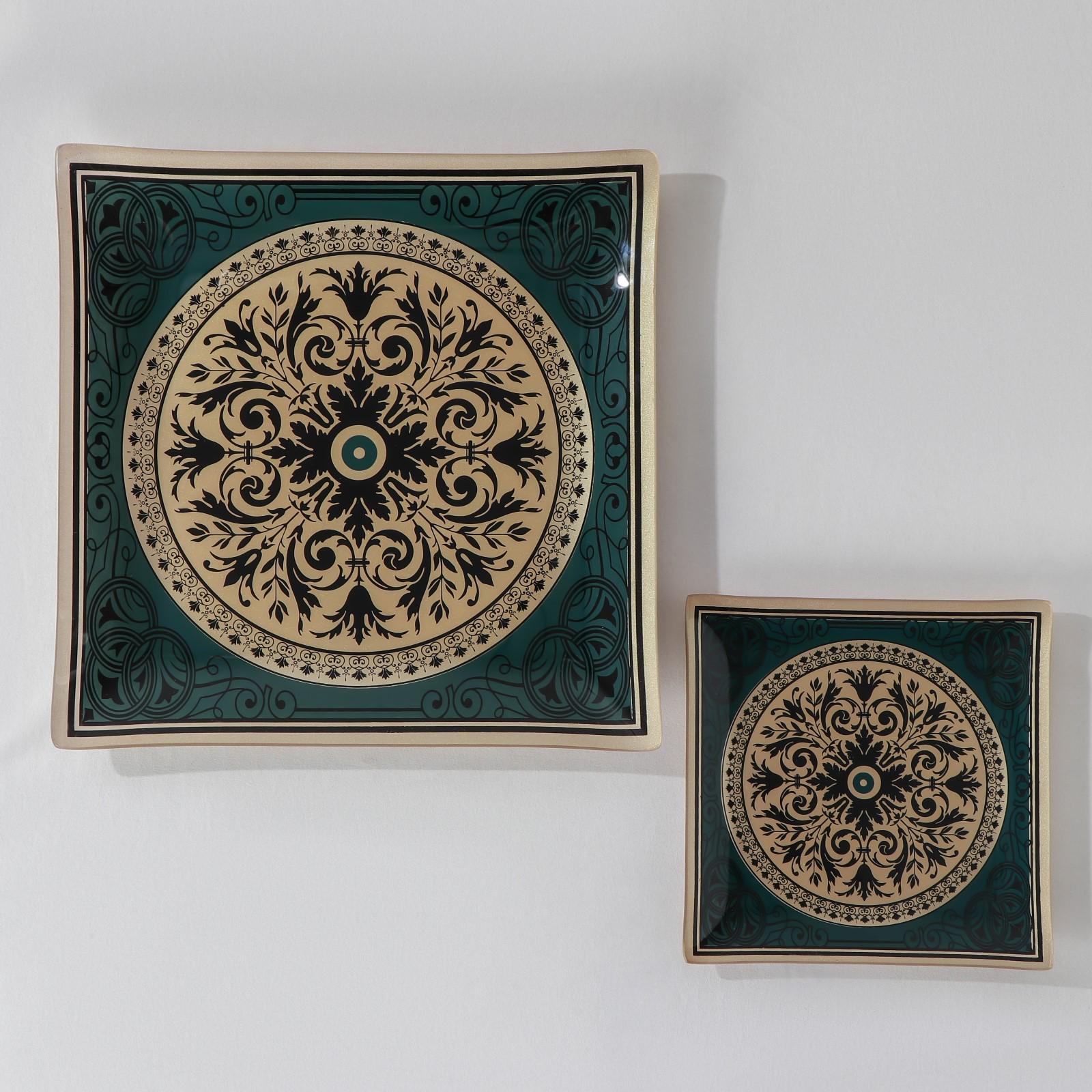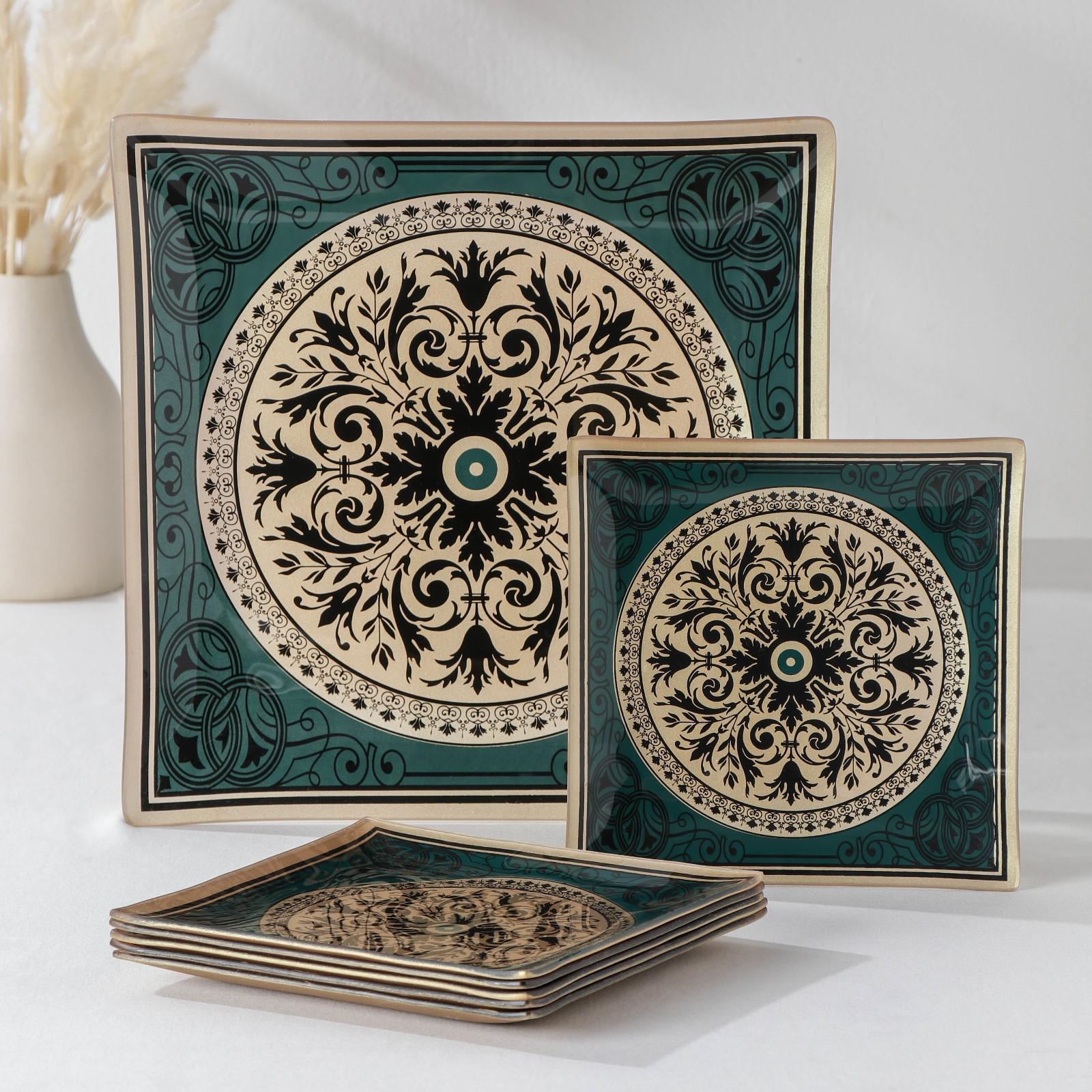 Набор столовый «Арабеска» состоит из 7 предметов: большого блюда и 6 тарелок. Посуда сделана из иранского стекла. Тарелки имеют восточный узор и подойдёт для праздничного стола. Большое блюдо можно использовать для подачи горячего, например, плова, а маленькие тарелки — для различных закусок.