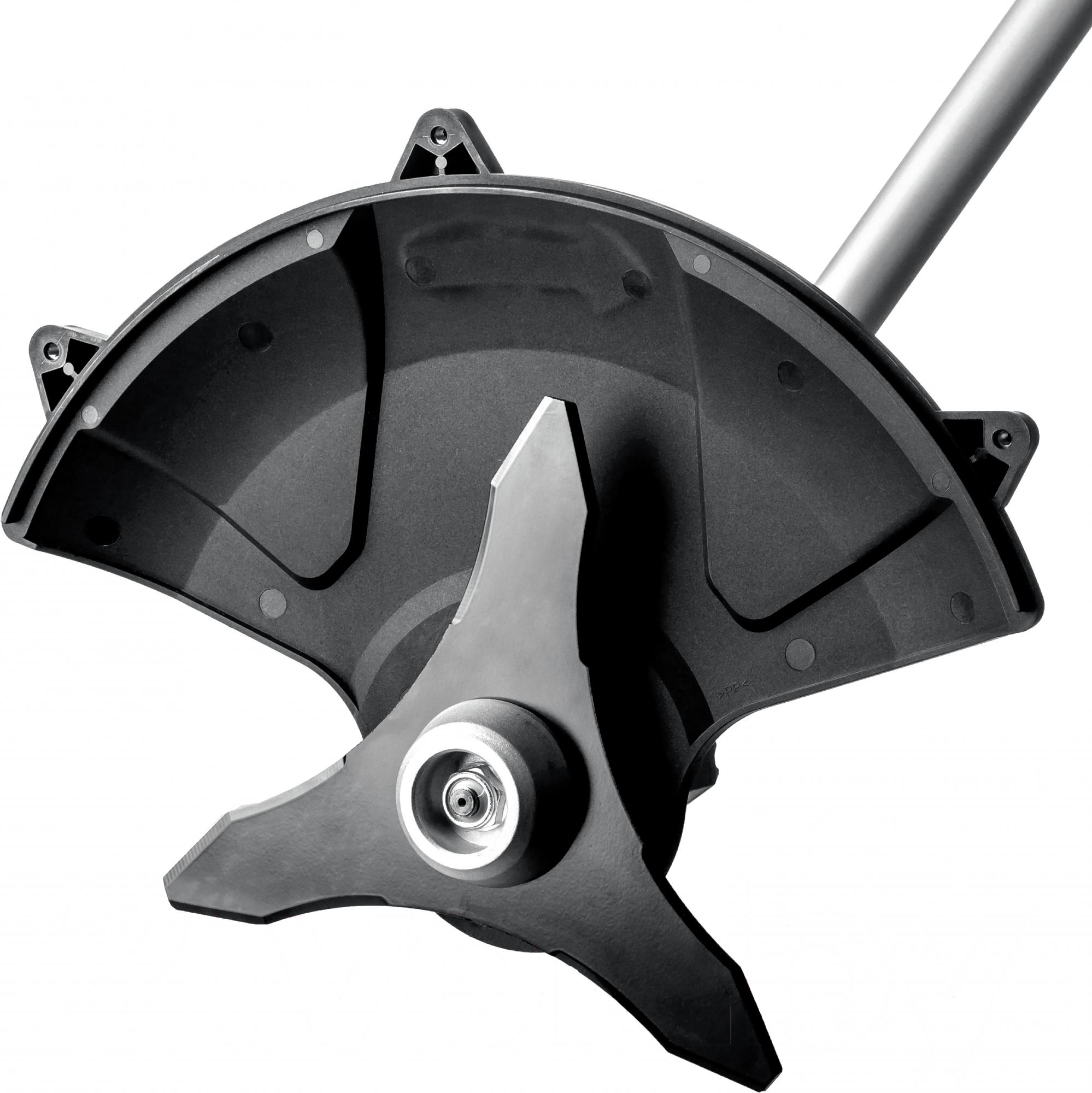 • В комплекте триммерная головка, диск/нож, плечевой ремень, защитный кожух, зарядное устройство, леска, аккумулятор, ограничитель (стопор), инструмент (ключ)