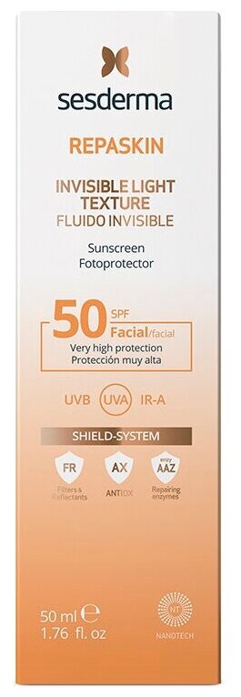 Сверхлегкое солнцезащитное средство для лица REPASKIN INVISIBLE LIGHT TEXTURE СЗФ50 SESDERMA. В жаркие дни кожа нуждается в особой заботе и надежной защите от УФ-облучения. Солнцезащитный крем REPASKIN INVISIBLE LIGHT TEXTURE СЗФ50 мгновенно впитывается, не оставляя на коже специфичного блеска, характерного для аналогичных средств. Препарат обеспечивает комплексный уход: оберегает кожный покров от солнечных лучей, оказывает антиоксидантное действие, повышает стойкость к агрессивному влиянию окружающей среды.