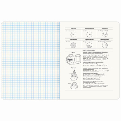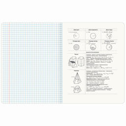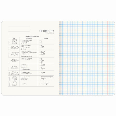 Тетрадь "Геометрия" формата А5 (165х202 мм) содержит 48 листов, изготовленных из высококачественной офсетной бумаги плотностью 65 г/м2 и белизной 100%. Листы соединены скобами. Линовка блока - в клетку, поля красные. Обложка выполнена из мелованного картона плотностью 190 г/м2 в тематике соответствующего предмета. Ламинация SoftTouch с тиснением фольгой обеспечивает обложке мягкий, бархатистый тактильный эффект. Углы тетради скруглены. В справочном материале собраны основные подсказки по школьному предмету для учащихся.