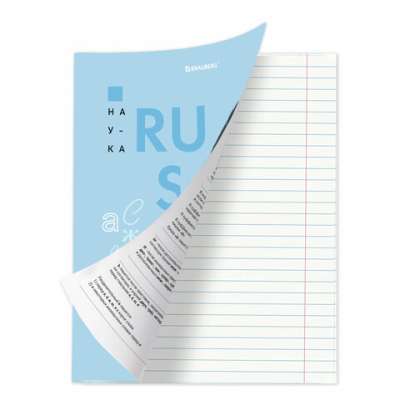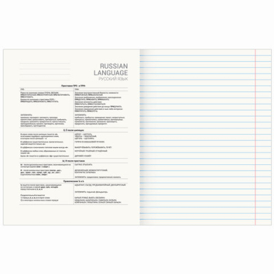 Тетрадь 48 листов "Русский язык", формат А5 (165х202 мм). Изготовлена из высококачественной офсетной бумаги плотностью 60 г/м2, белизной 100%. Листы соединены скобами. Линовка блока - в линию, поля красные. Обложка выполнена из мелованного картона плотностью 190 г/м2. В справочном материале собраны основные подсказки по школьному предмету для учащихся.