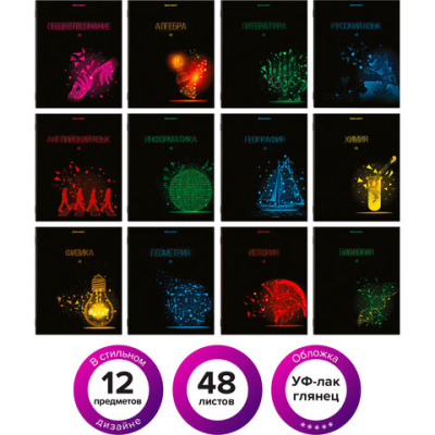 Предметные тетради BRAUBERG из серии "DARK" со справочным материалом предназначены для учащихся средних и старших классов. Покрытие глянцевым лаком обеспечивает обложке неповторимый визуальный эффект. В комплекте 12 тетрадей: Обществознание, Алгебра, Английский язык, Биология, География, Геометрия, История, Физика, Химия, Информатика, Литература (в линию), Русский язык (в линию).