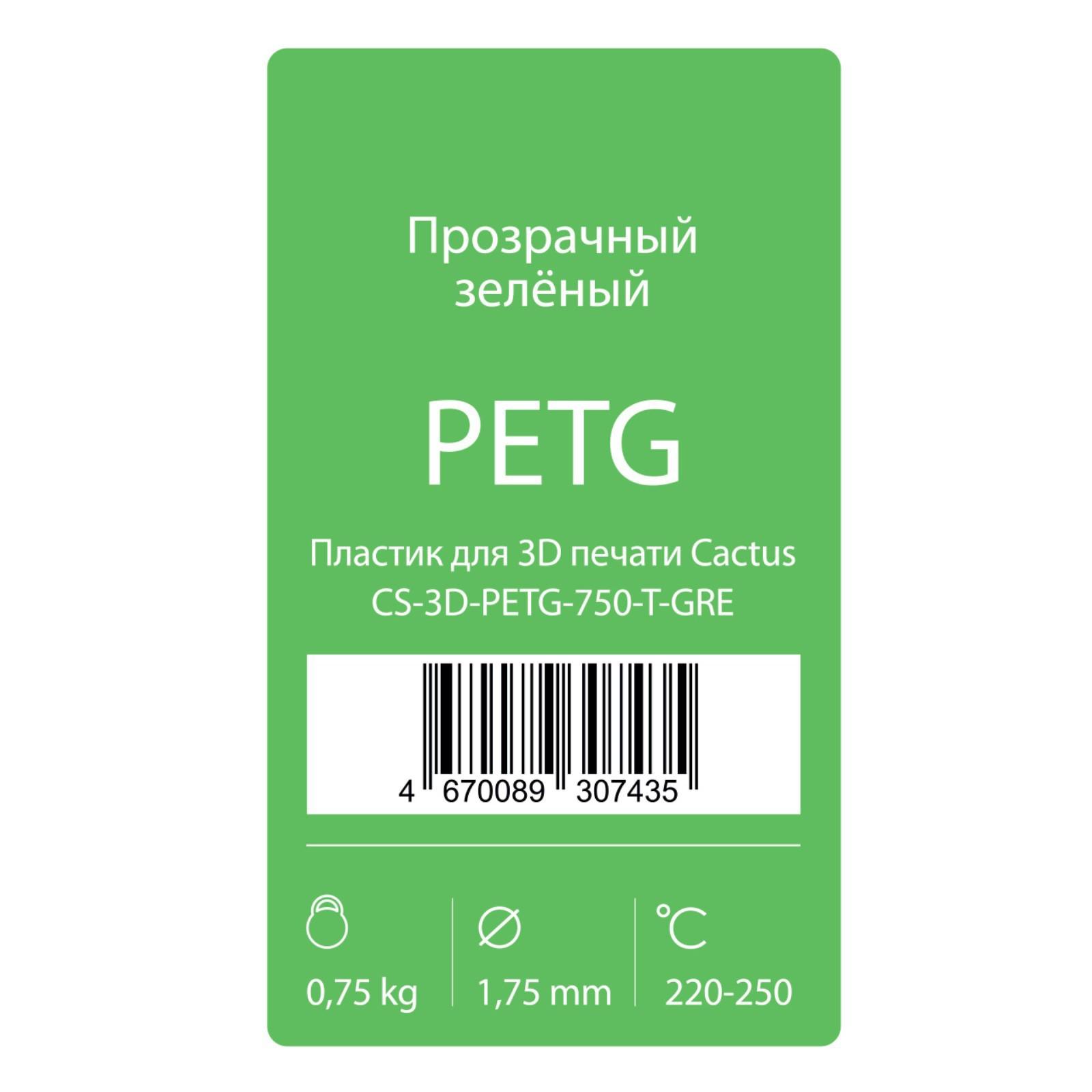 Пластик для 3D принтера Cactus (CS-3D-PETG-750-T-GRE), PETG, 1.75,0.75кг, прозрачный зеленый 93766