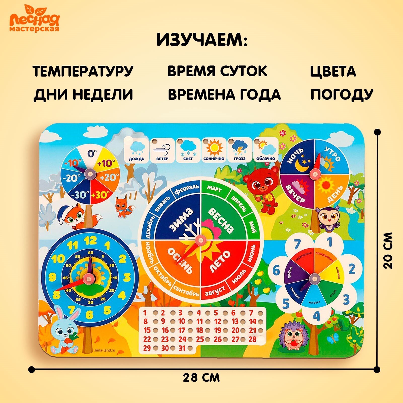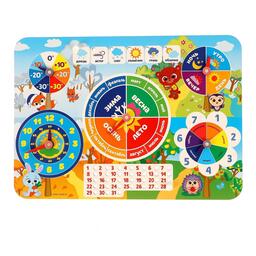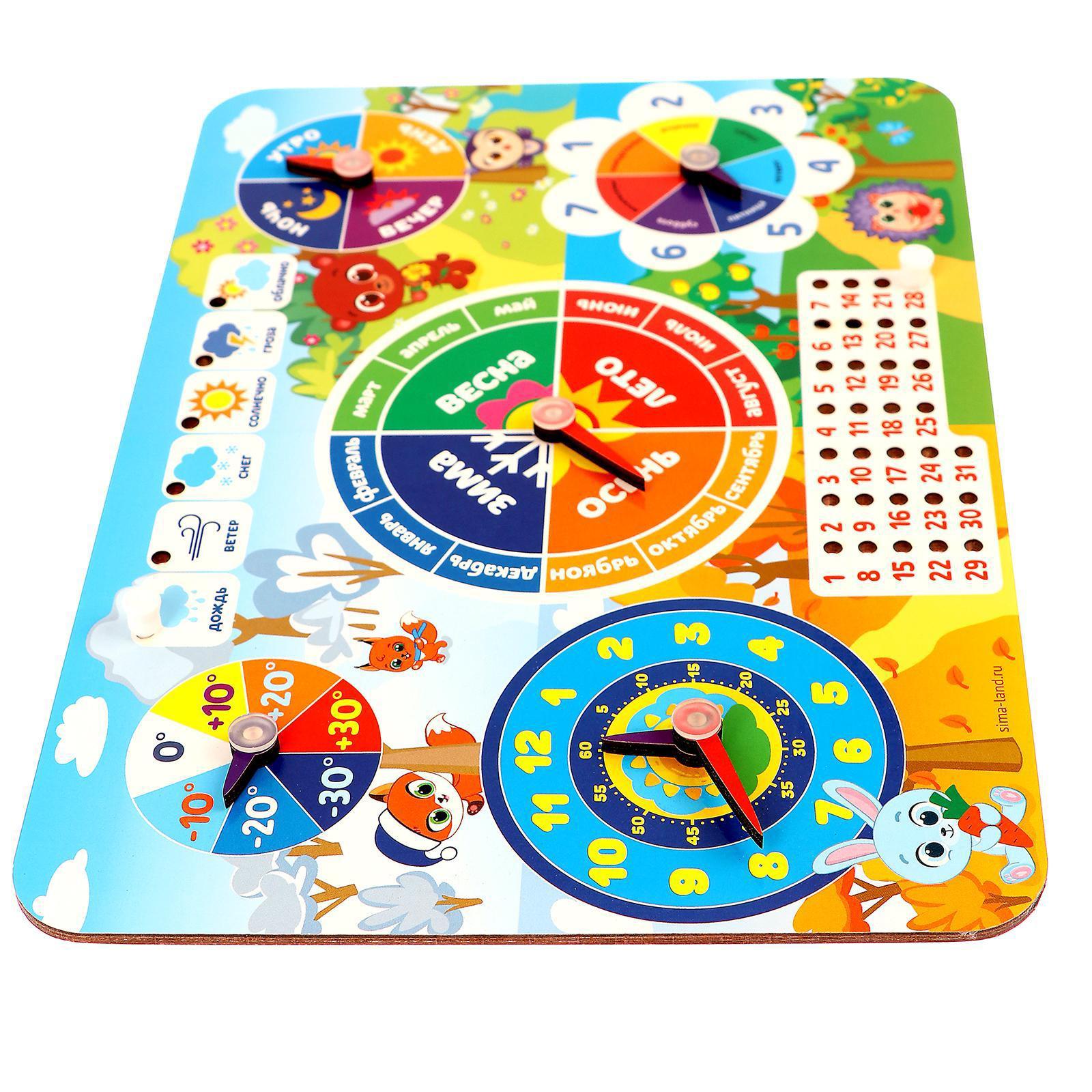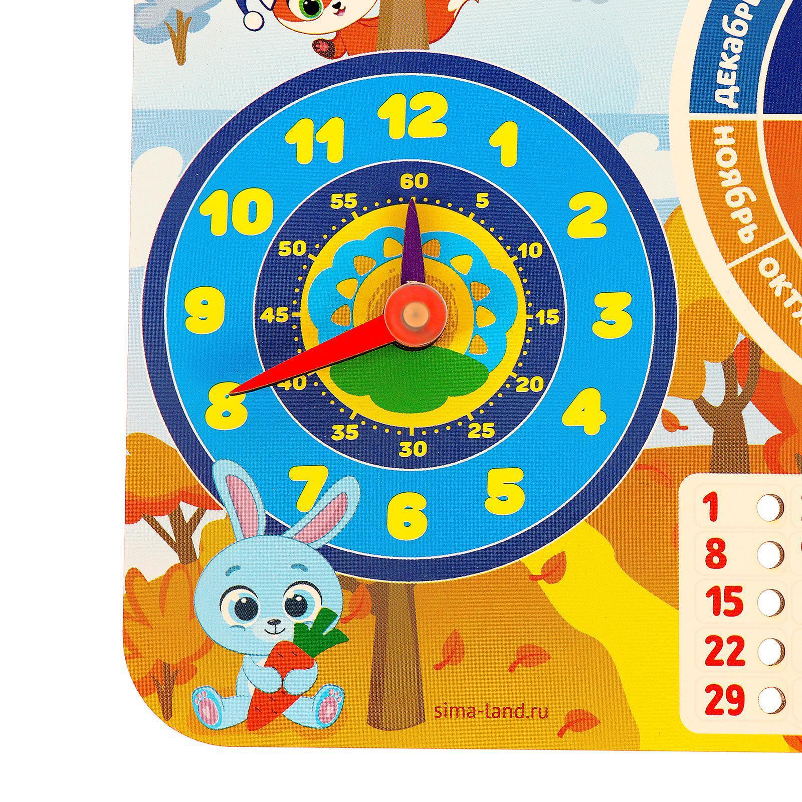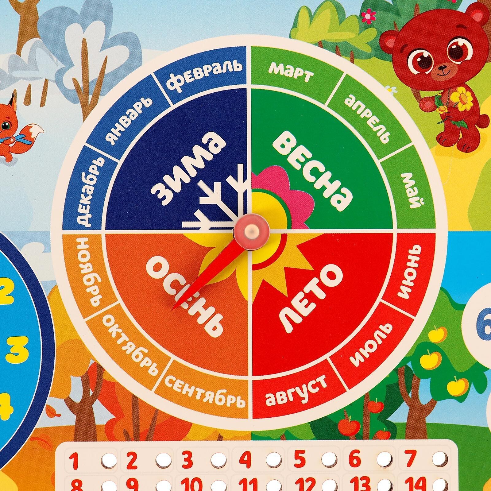Изображение разделено на несколько тематических зон, которые знакомят со временем, датой, месяцами, днями недели, временами года, погодными условиями.