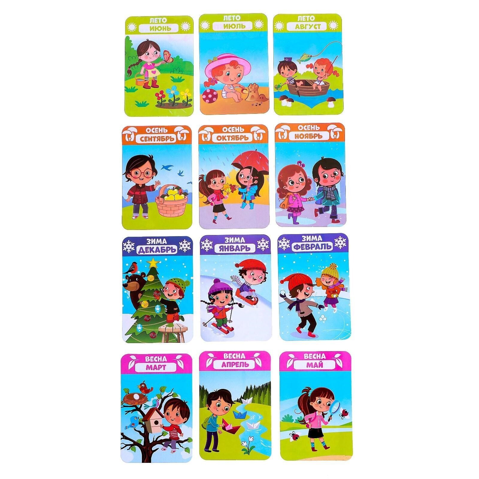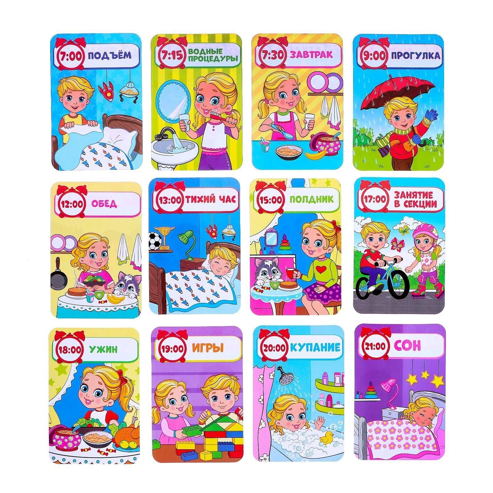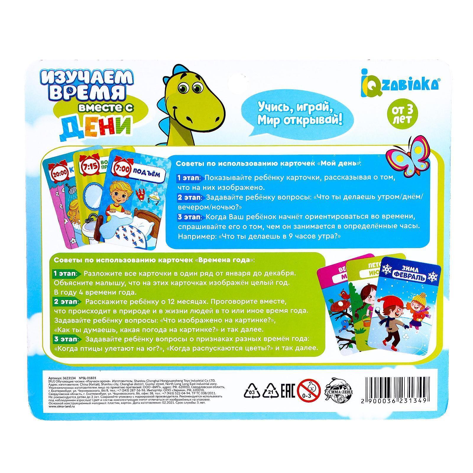 С обучающими часиками ребёнок научится определять время. А с помощью ярких карточек узнает о распорядке дня, запомнит месяцы и времена года.