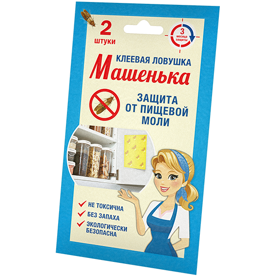 Экологически безопасное средство для отлова бабочек пищевой моли в закрытых местах хранения сухих продуктов (круп, макаронных изделий, муки, орехов, бобовых, сухофруктов) без токсичных веществ и раздражающего запаха. Клеевая ловушка может применяться как в бытовых условиях (на кухне, в кладовой), так и на продуктовых складах, в магазинах, пищеблоках. Ловушка служит надежным индикатором появления насекомых и позволяет быстро принять меры для их уничтожения. Натуральный феромон в составе клеевого слоя привлекает насекомых и способствует их быстрому отлову. Ловушка работает в течение 90 дней с момента установки.