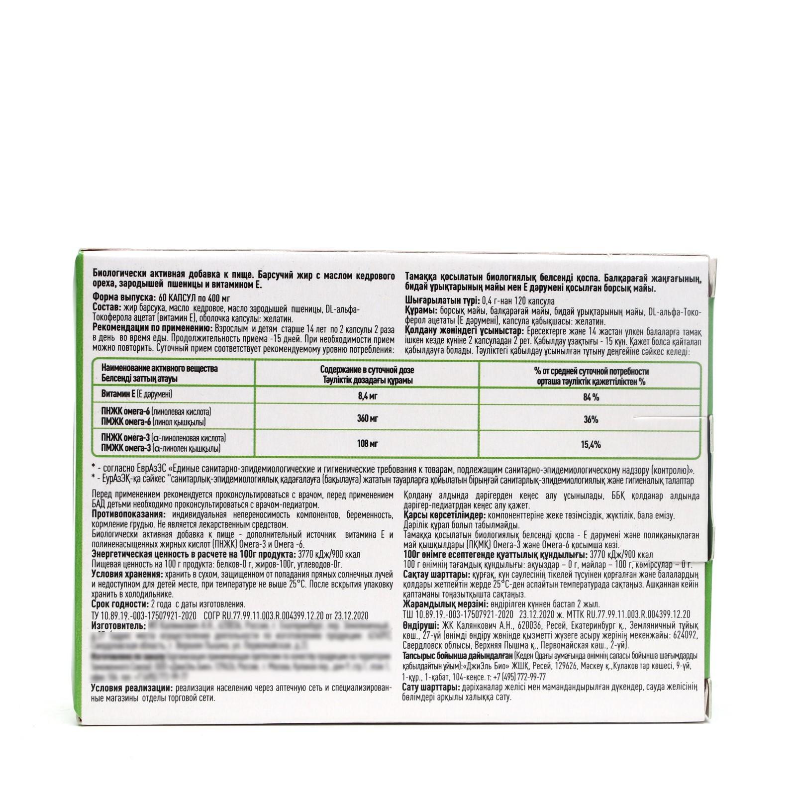 Состав: жир барсука, масло кедровое, масло зародышей пшеницы, витамин Е, оболочка капсулы -желатин.