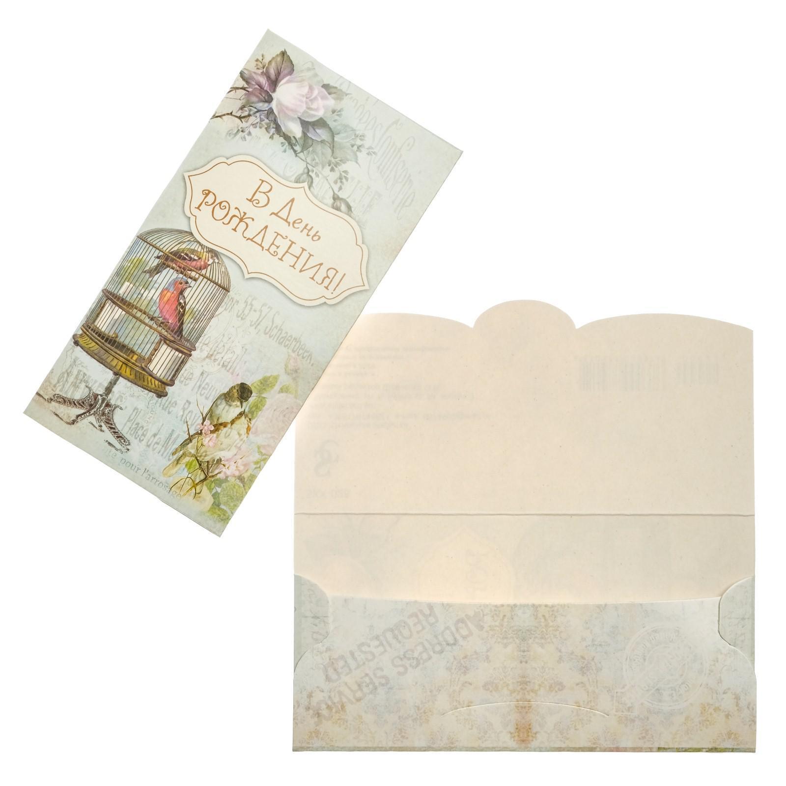 Конверт для денег "В День Рождения!" птицы в клетке