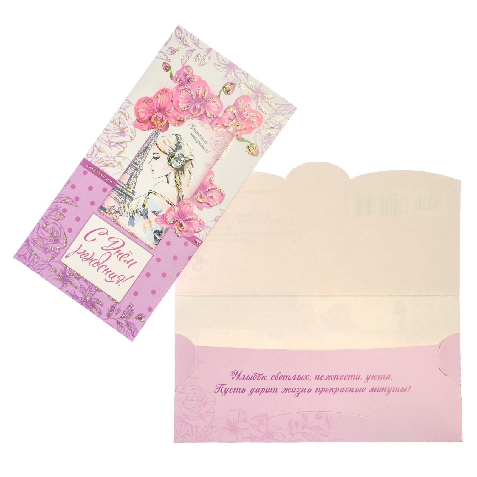 Конверт для денег "С Днем Рождения!" глиттер, Эйфелева башня, цветы