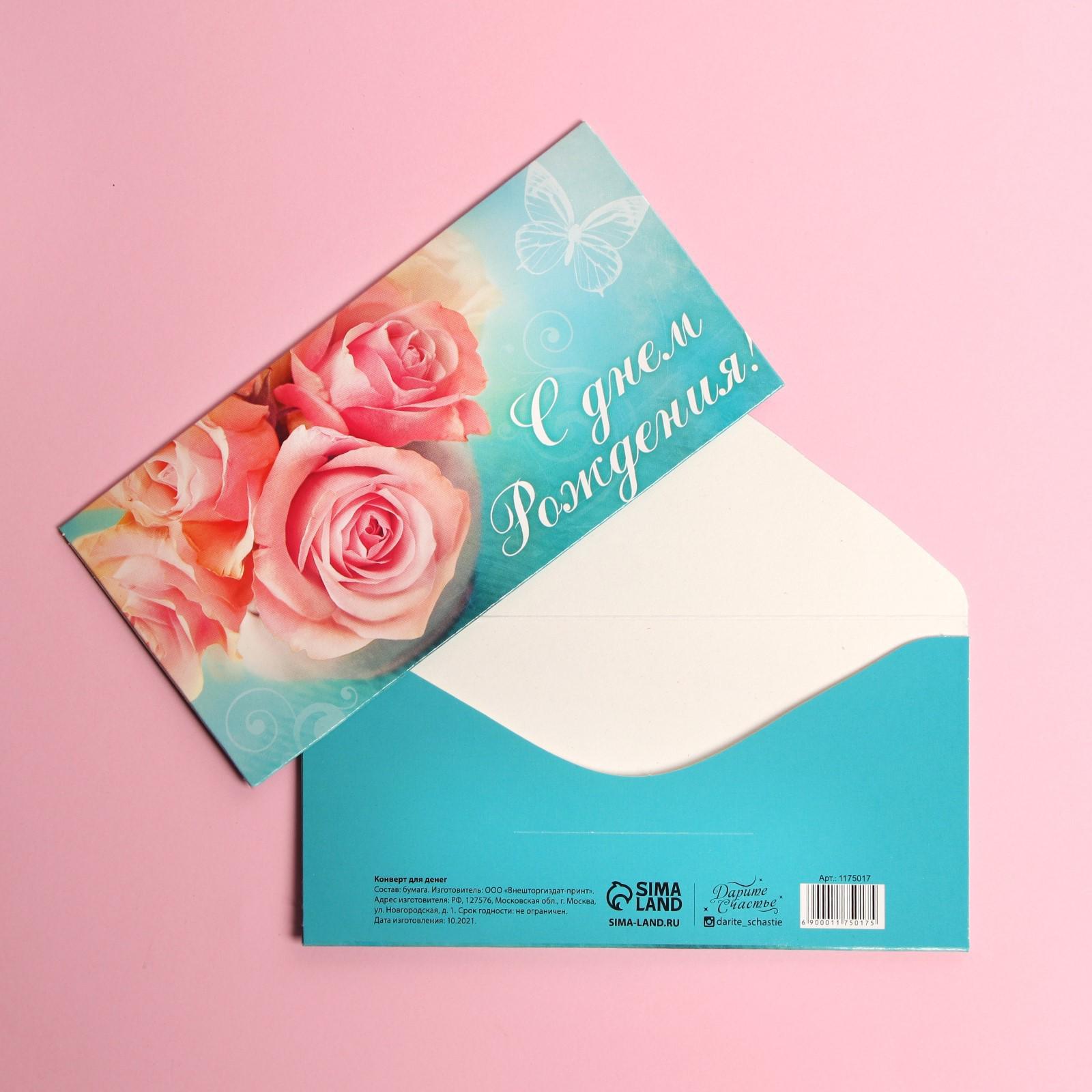 Конверт для денег «С Днём Рождения», розовые розы, 16,5 × 8 см