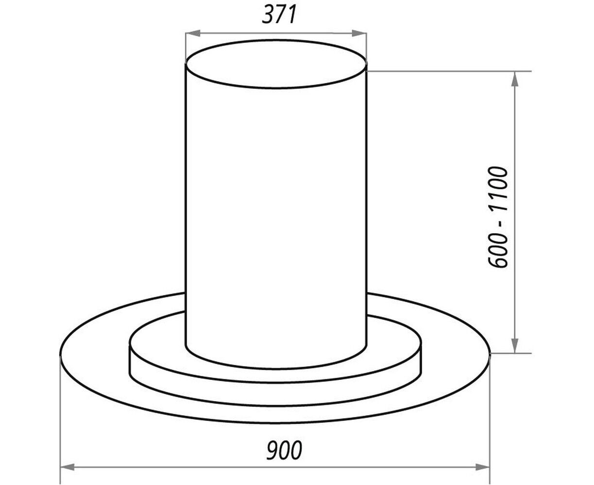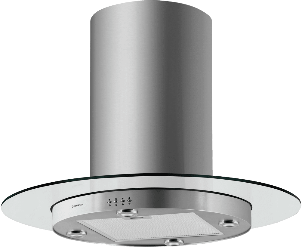 Корпус цилиндрической формы выполнен из матированной нержавеющей стали. Крепится на потолок над поверхностью плиты. Накладная панель из закаленного стекла диаметром 90 см значительно увеличивает площадь рабочей зоны. В нижней части вытяжки находится алюминиевый многослойный жироулавливающий фильтр. Он легко вынимается и полностью разбирается, что сильно упрощает чистку.