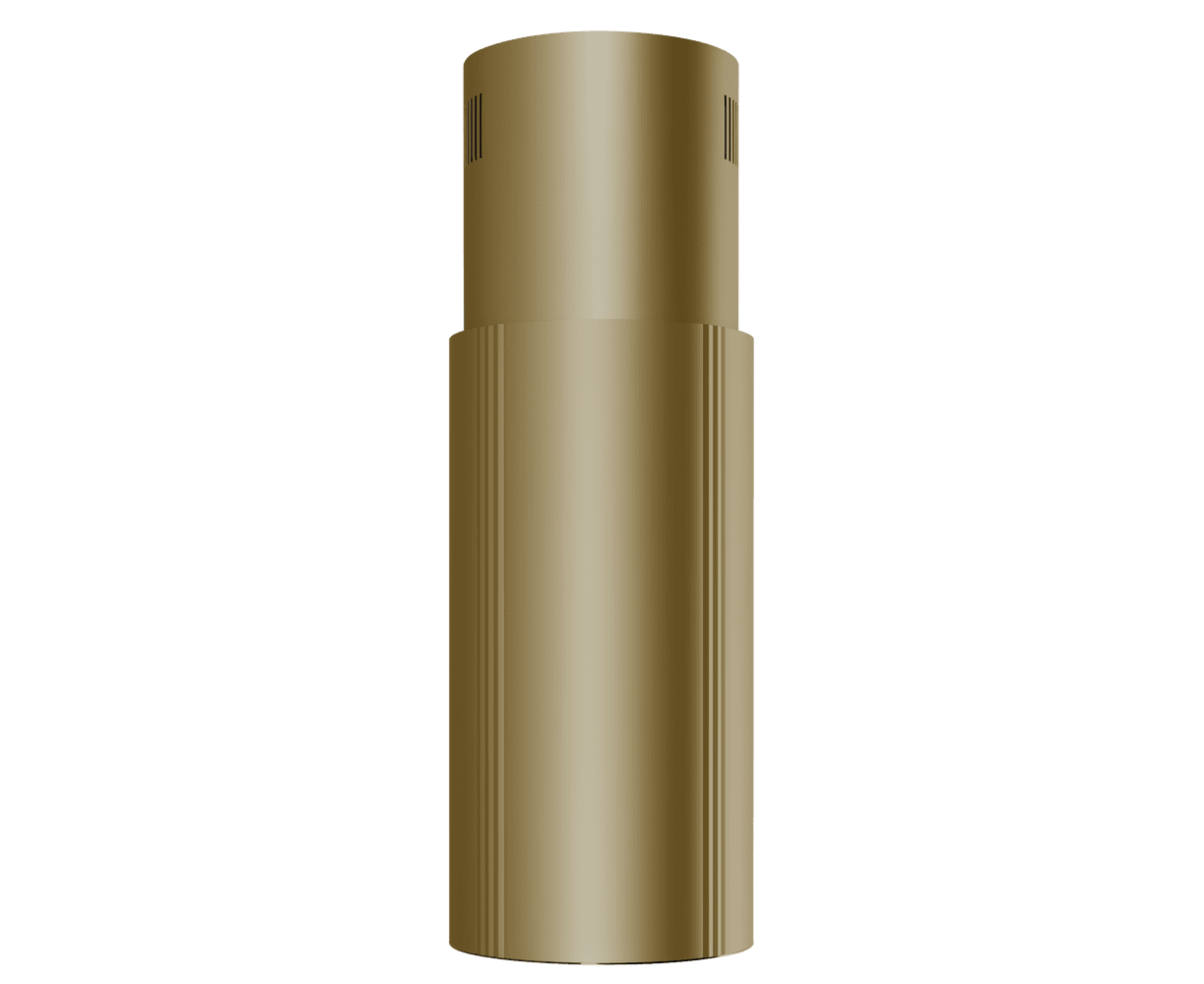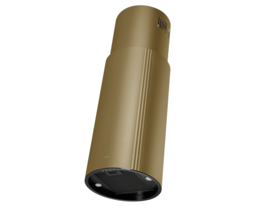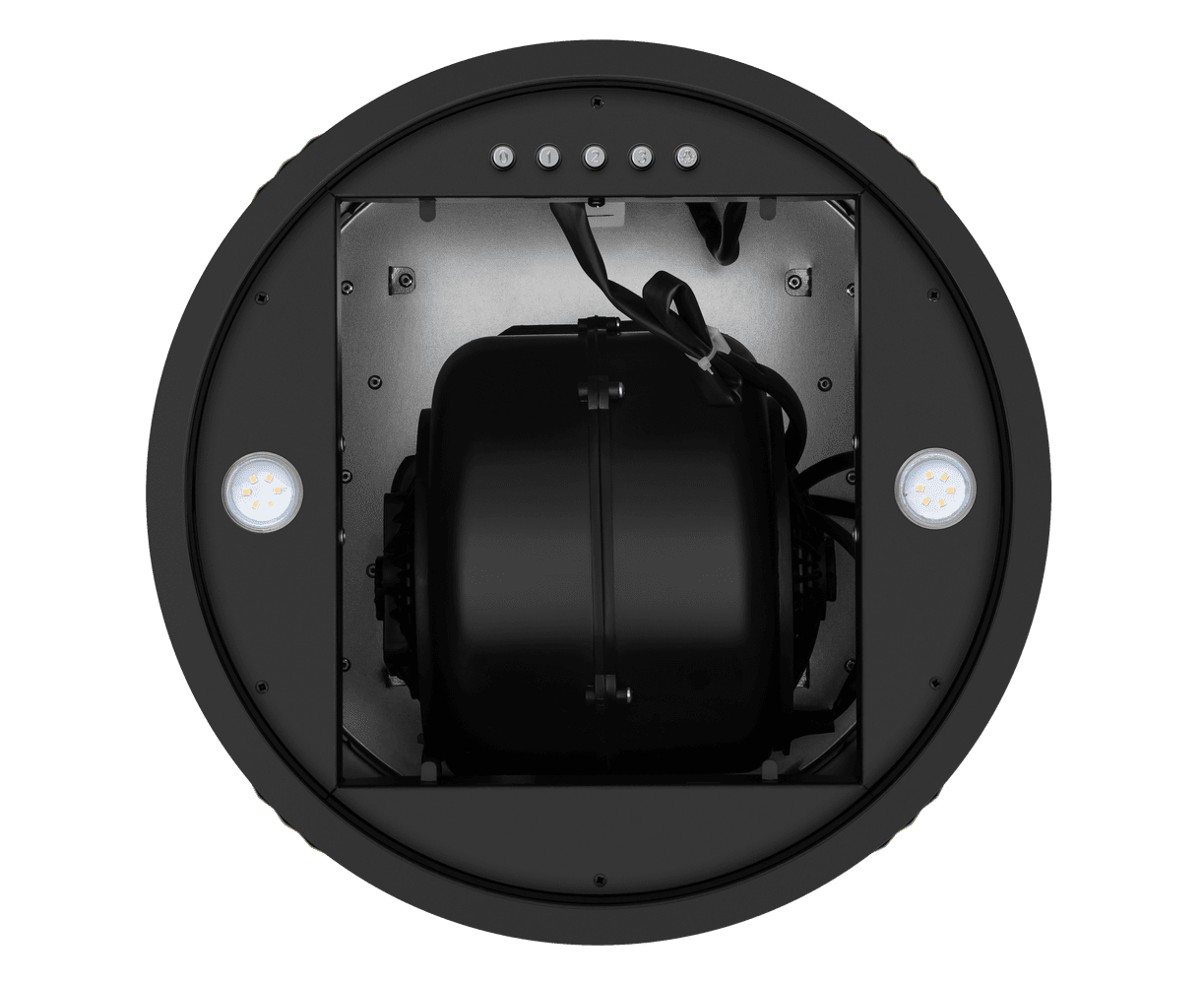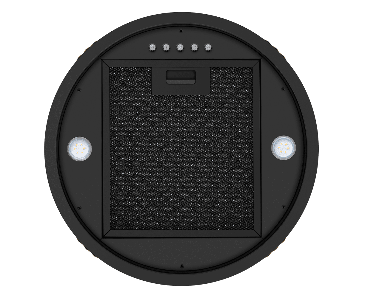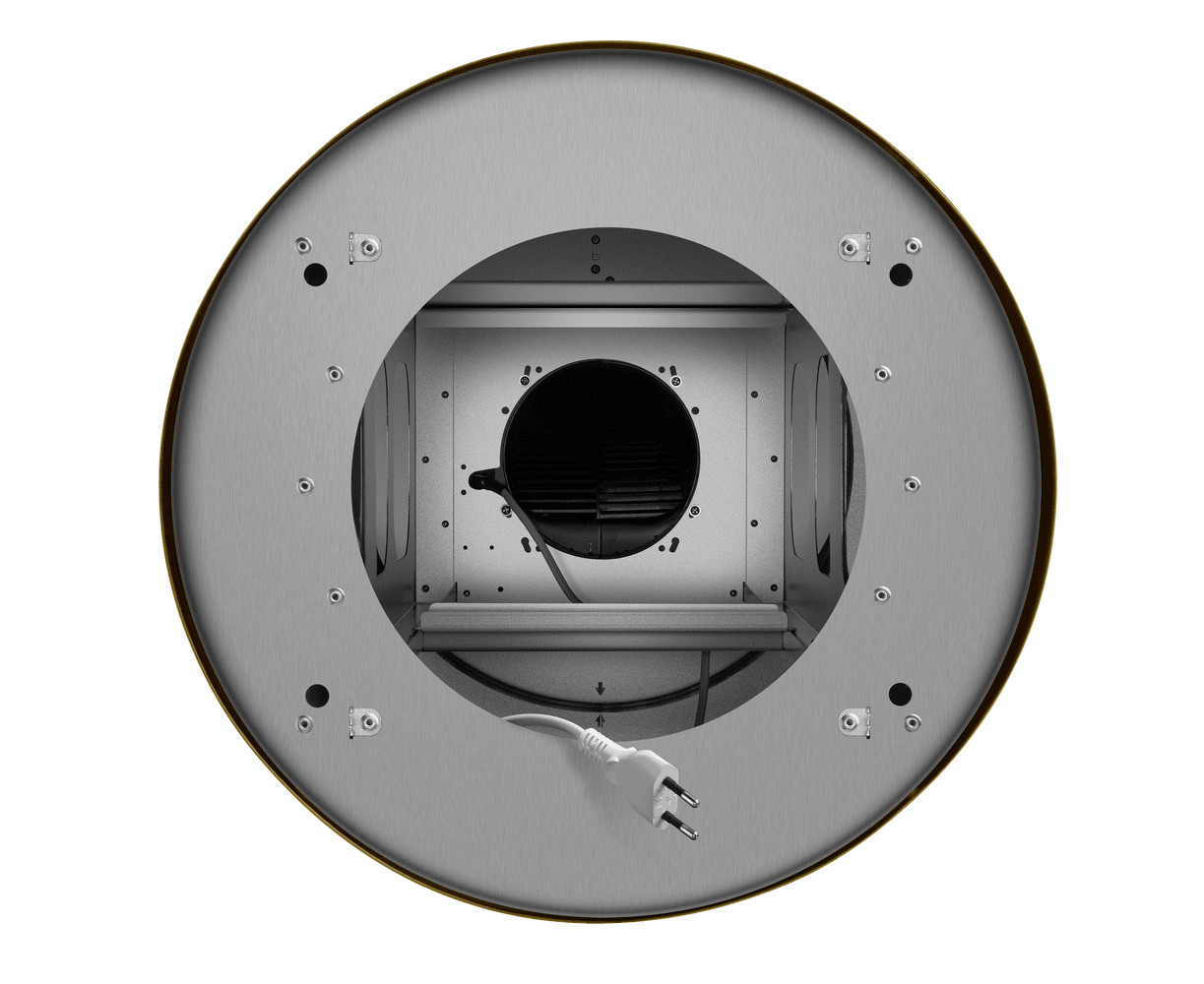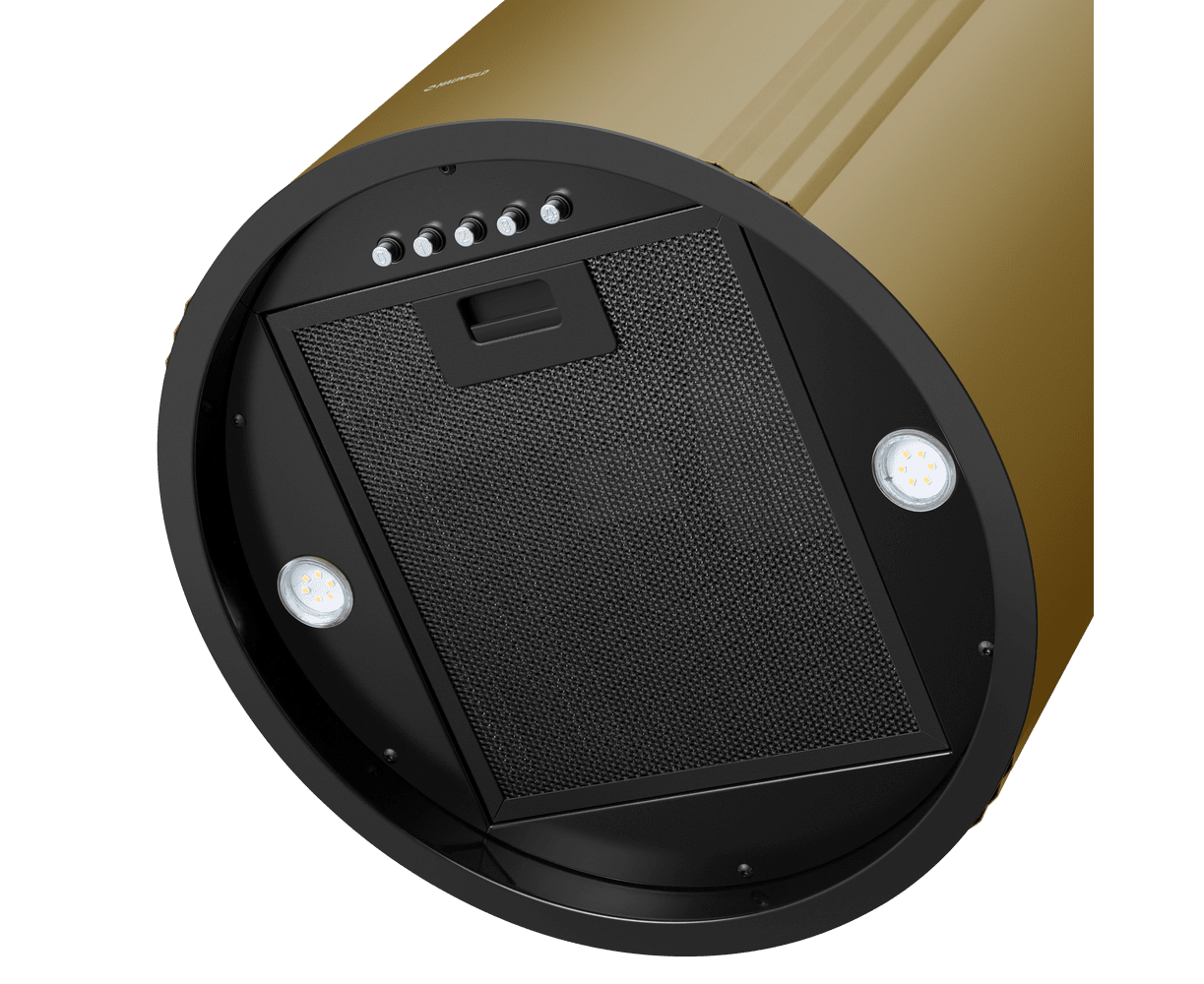 Корпус цилиндрической формы, выполненный из нержавеющей стали с термостойким покрытием, крепится на потолок над поверхностью плиты. В нижней части вытяжки находится алюминиевый многослойный жироулавливающий фильтр. Он легко вынимается и полностью разбирается, что сильно упрощает чистку.