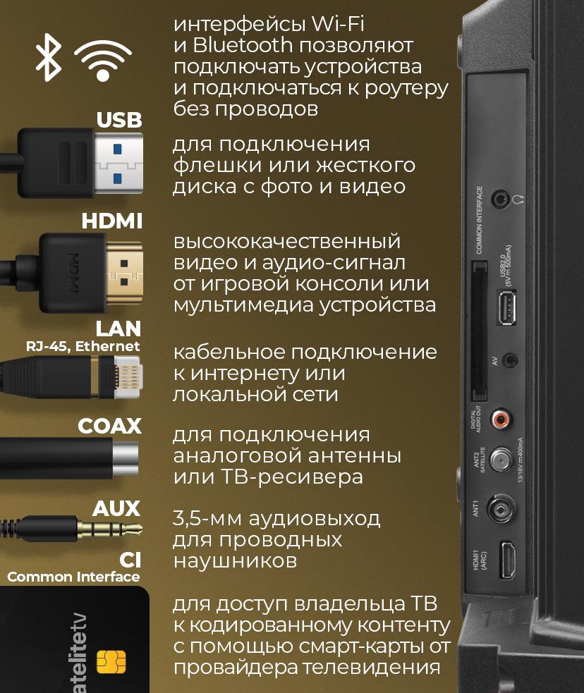 • Входы/выходы S/PDIF (коаксиальный), антенный вход (RF) (2 шт), аудиовыход 3.5 мм, RJ-45 (LAN), CI/CI+, USB, AV in