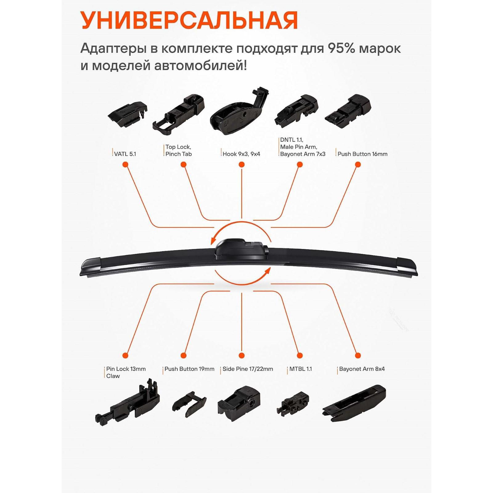 Щетка стеклоочистителя с бескаркасной конструкцией обладает рядом существенных преимуществ. К ним стоит отнести максимальную плотность прилегания щеток к стеклу, отличное аэродинамическое сопротивление, обеспечивающее бесшумное и быстрое скольжение изделия. За счет плотного прилегания к стеклу щетки способны очищать даже самые труднодоступные загрязнения. Особый состав резины препятствует старению и износу изделия. В комплекте к щетке прилагаются адаптеры, которые необходимы для установки на автомобили различных марок (подходя для 95% марок и моделей автомобилей).
