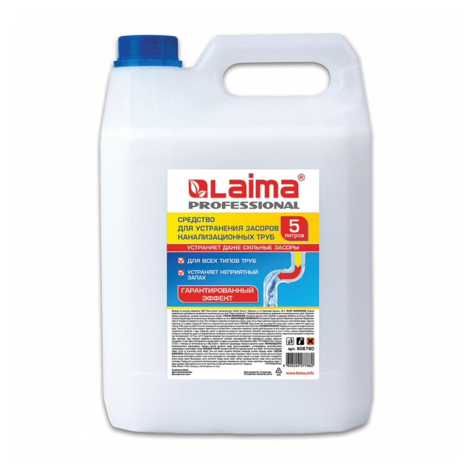 Заводская упаковка нарушена или отсутствует. Товар НОВЫЙ, в полной комплектации. / Поставляется в канистре объемом 5 л.Способ применения: аккуратно залить в сток 200-500 мл средства. Оставить на 30 минут. Пролить сильной струёй воды. В случае сильных засоров оставить на ночь.Состав: вода, более 5%, но менее 15% гипохлорит натрия, менее 5% гидроксид натрия, ПАВ, лаурилсульфат. В случае замерзания при размораживании средство сохраняет свои свойства.ТУ 2389-001-93339783-2014.Покупайте средство для прочистки канализационных труб LAIMA "PROFESSIONAL" в нашем интернет-магазине! Форма выпуска: жидкость. Объем/вес: 5000 мл/г. Материал труб: универсальный. Эффект от использования: устраняет засоры, устраняет неприятный запах. Упаковка: канистра Бренд - ЛАЙМА. Производитель - Россия. . Штрихкод - 4606224277882