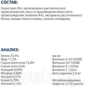 • Основные ингредиенты мясо, рис, ягненок, овощи/фрукты, злаки