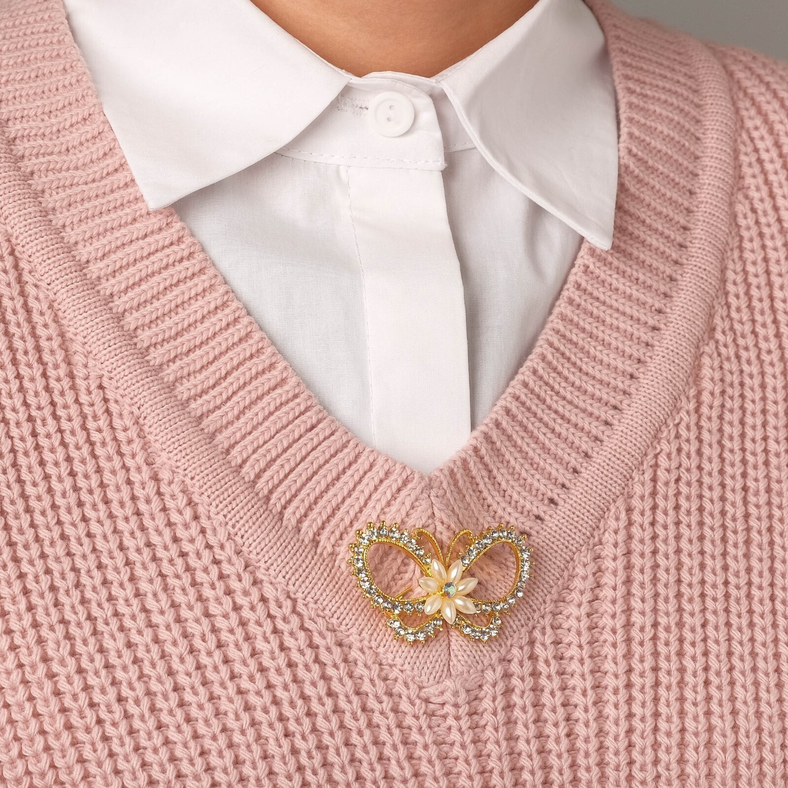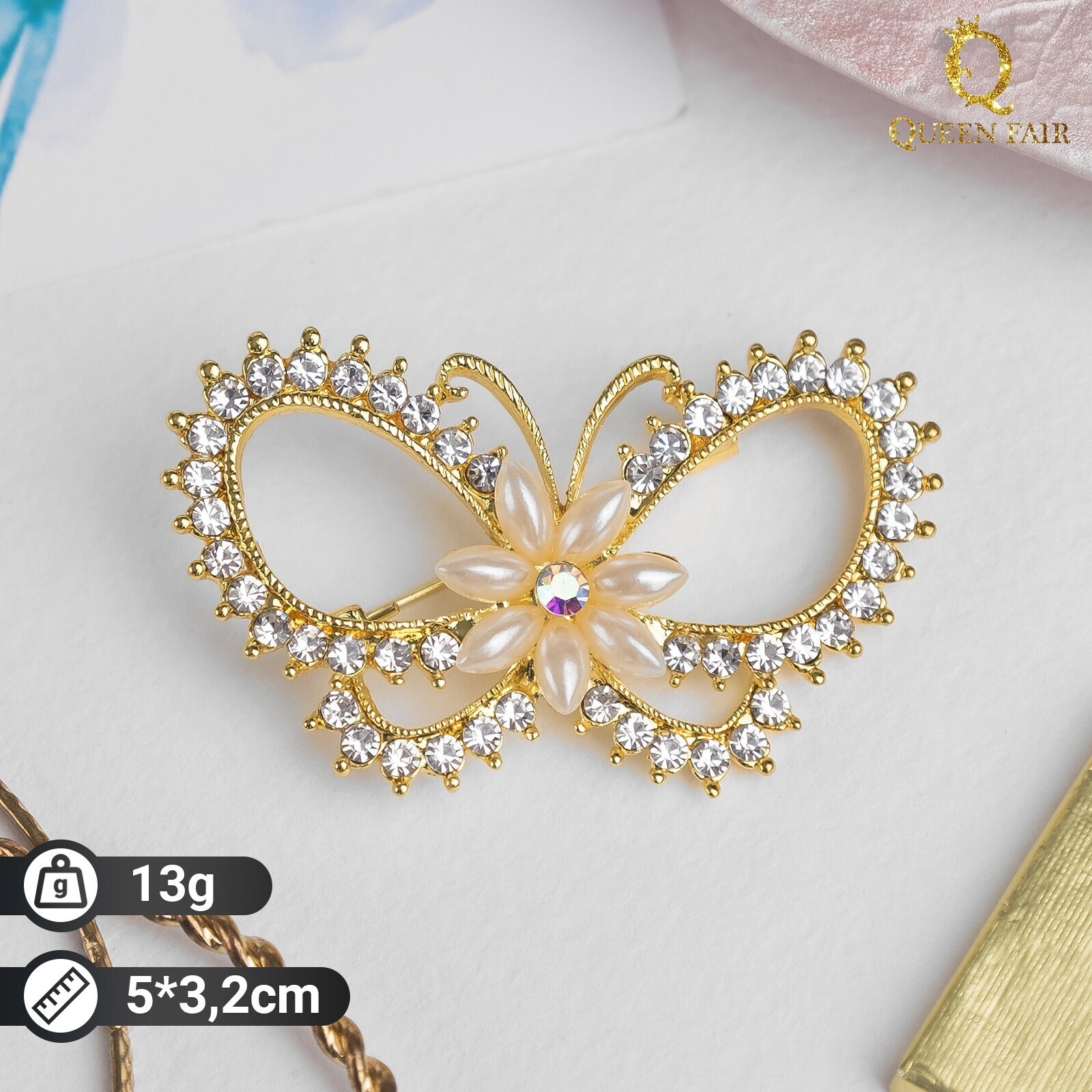 Брошь "Цветочная бабочка", цвет белый в золоте